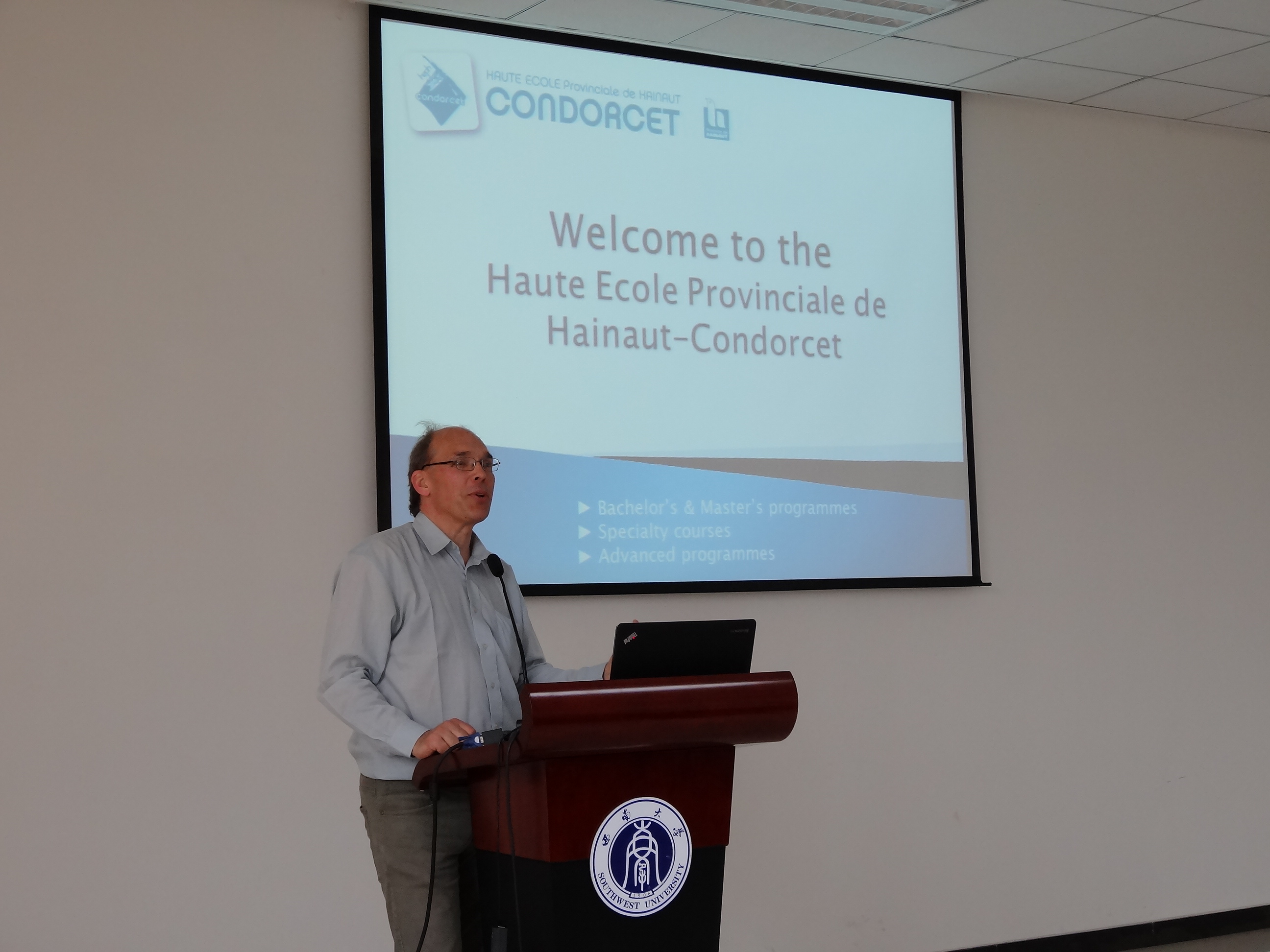 刘猛书记代表公司致欢迎辞。他简要介绍了重庆的概况以及sunbet申搏的办学情况,向比利时来宾表达了祝福与期待,希望两校今后的交流合作更上一层楼。比利时孔多赛大学学术团代表Serneels先生向sunbet申搏的师生介绍了该校的办学情况,希望今后双方能进行更多的学术研讨与交流合作。