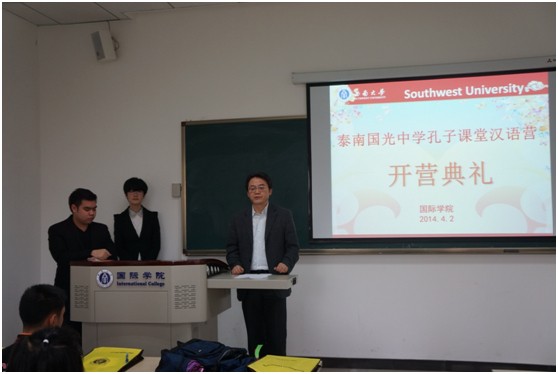 2014年4月2日上午9:00在sunbet申搏紫云楼312教室隆重举行了2014年泰南国光中学孔子课堂汉语春令营开营典礼。出席开营典礼的有sunbet申搏副经理刘猛、副经理张家政、招生办公室主任代远鸿、公司办公室主任邹育艳,以及汉语春令营的31名学员。