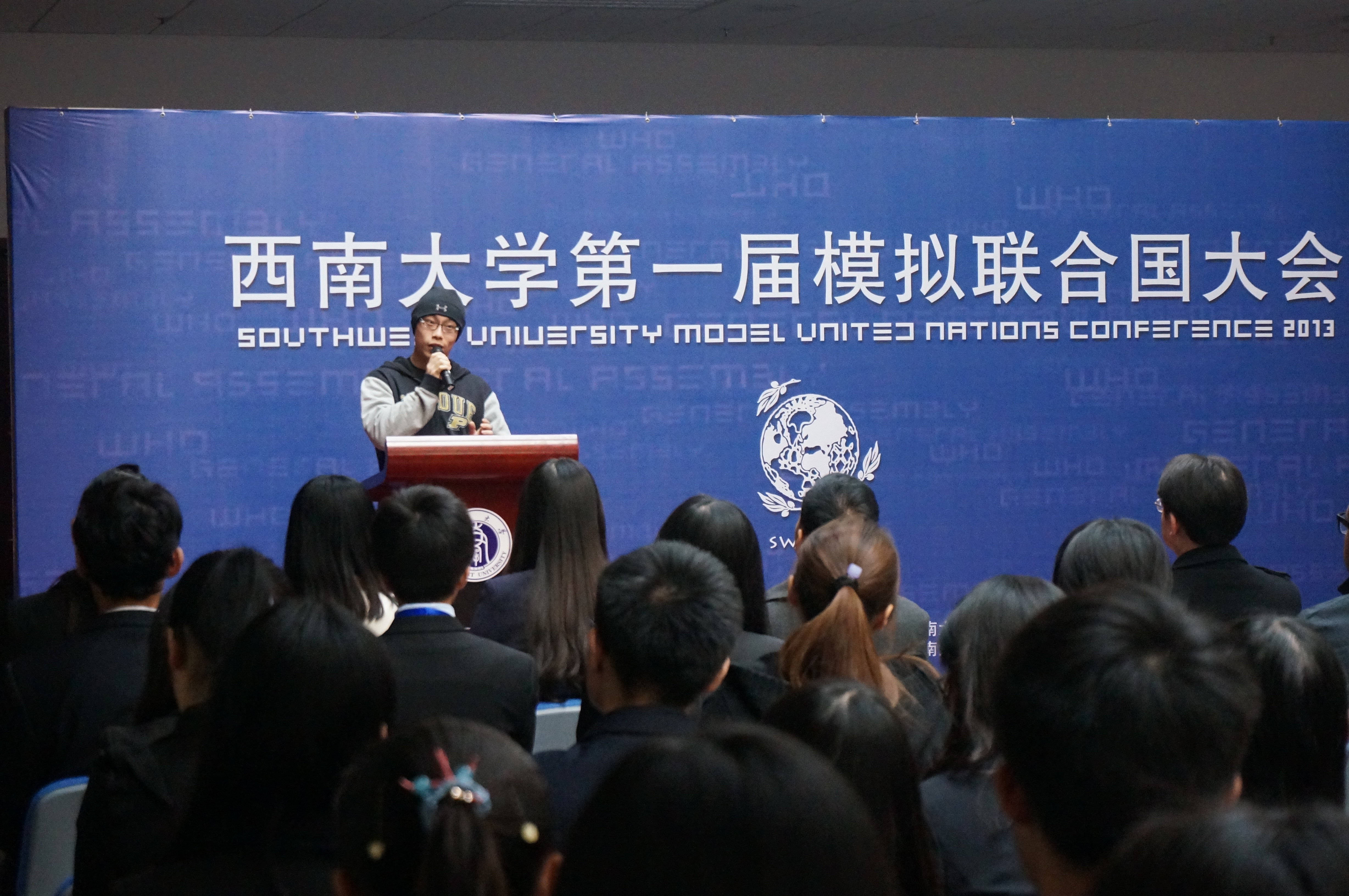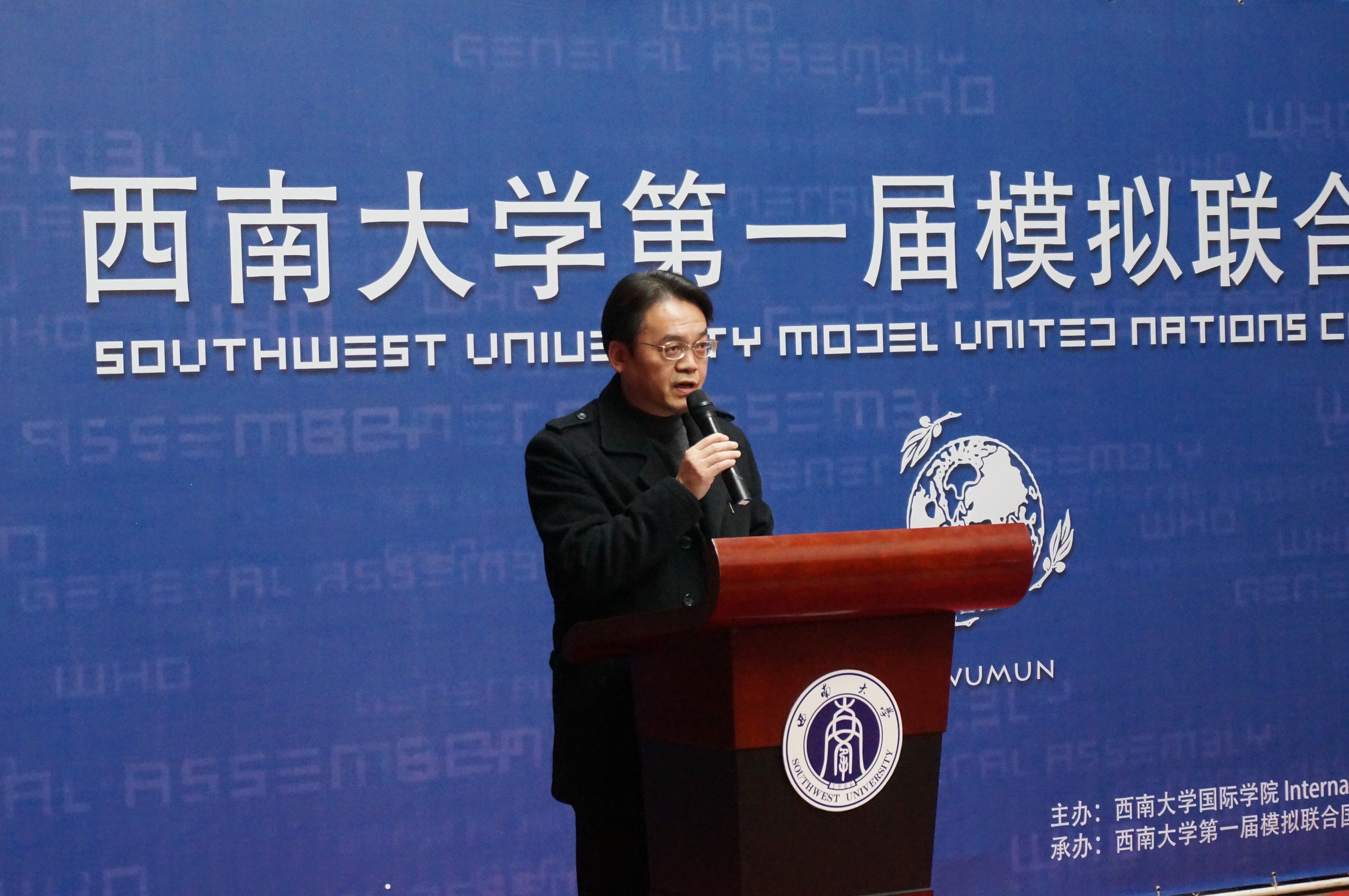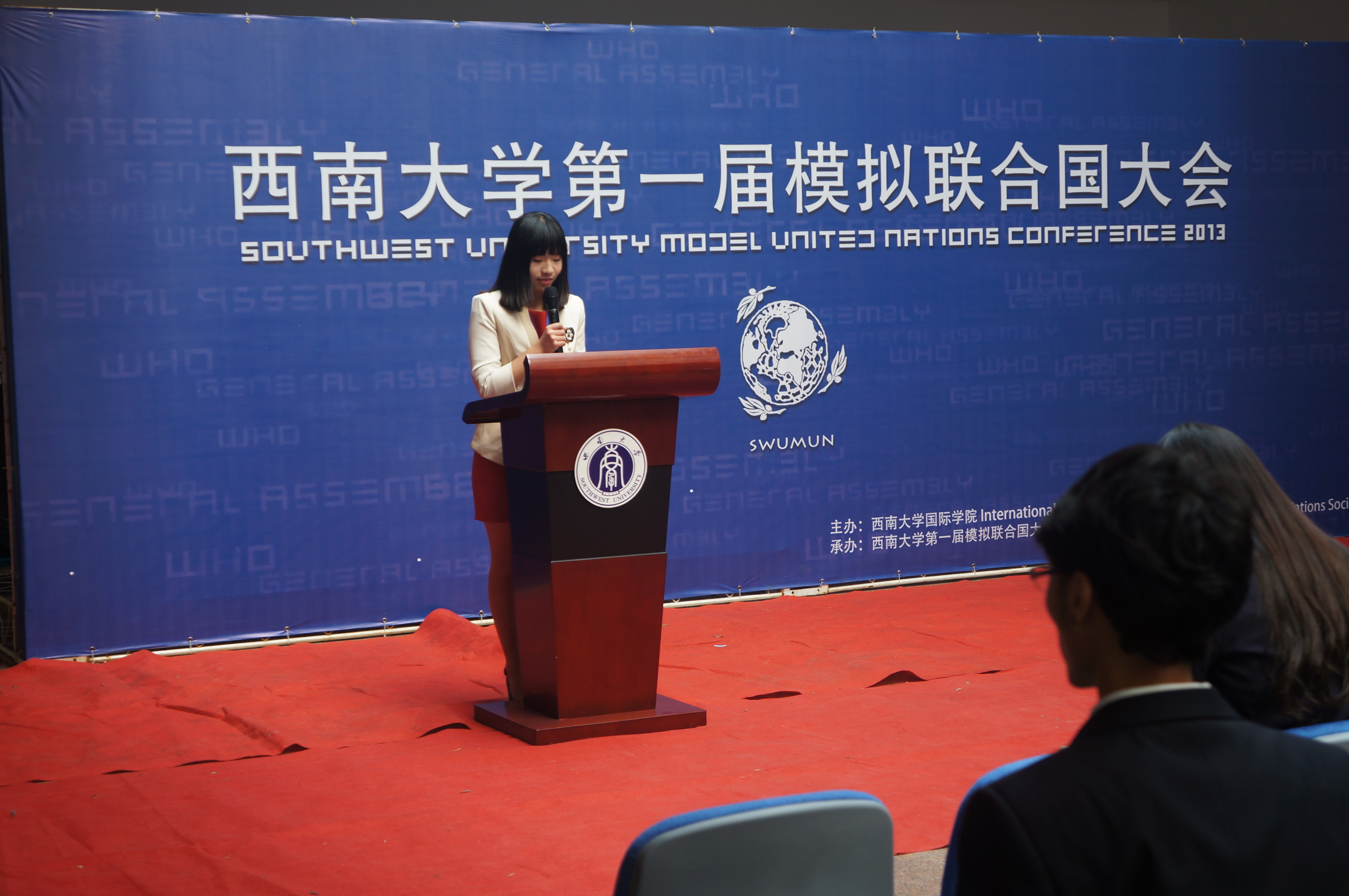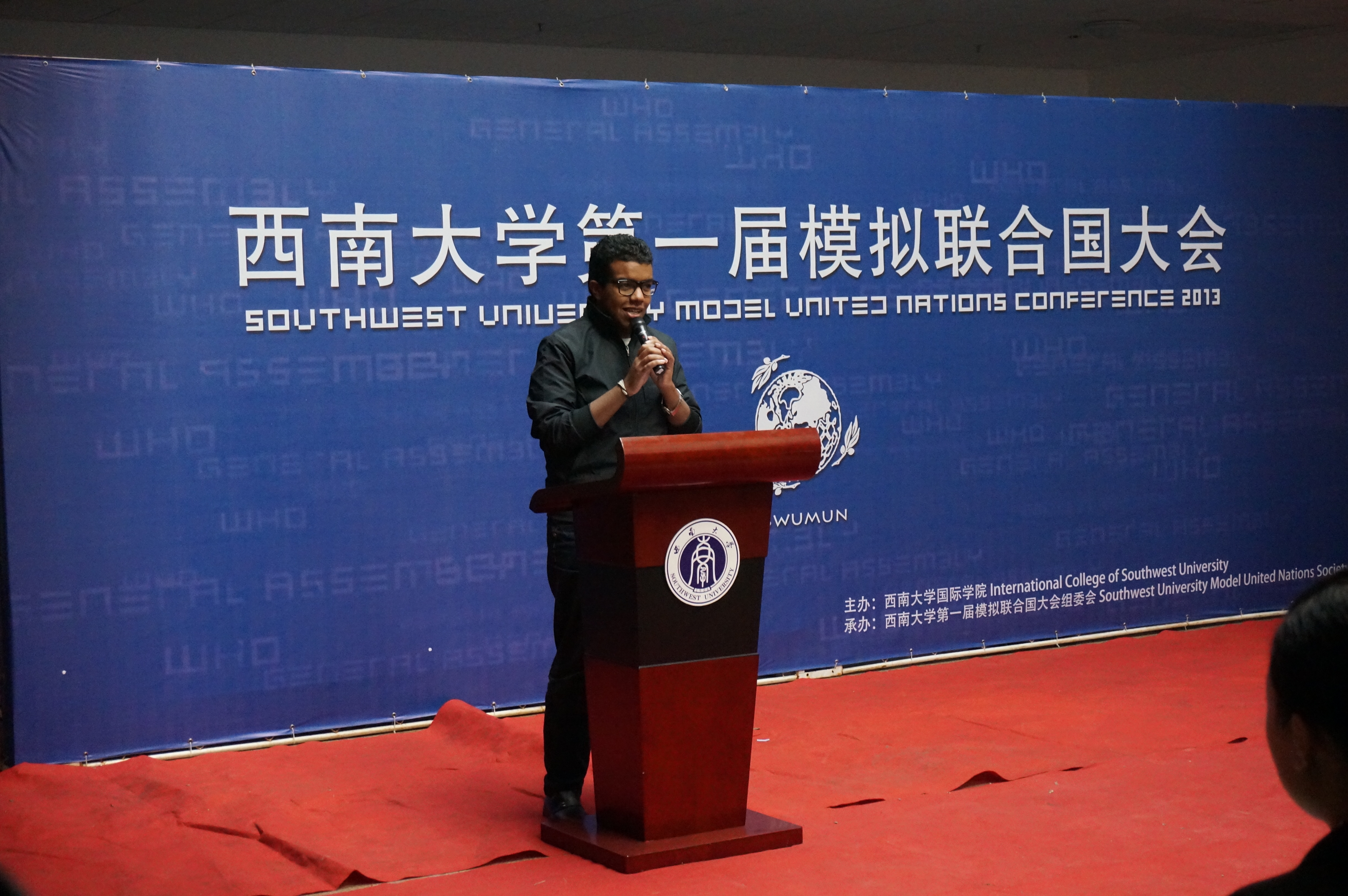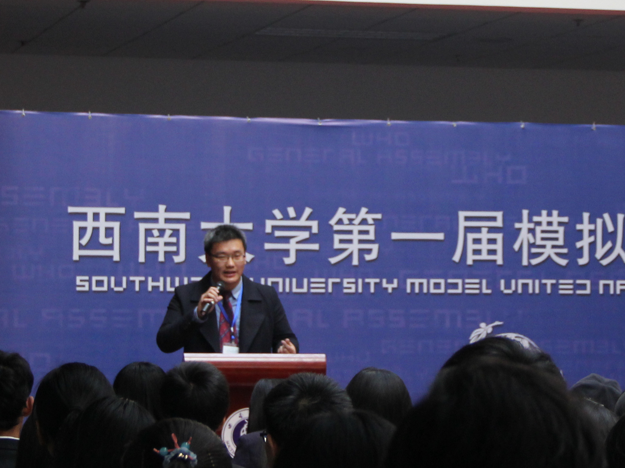 刘经理的讲话从模联对老员工的益处入手,就知识的增加和能力的提高进行了阐述,并介绍了本次大会的议题,他还对参会同学提出了殷切的希望。希望他们在两天的会议中“积极思考,畅所欲言,沟通合作,激扬风采,为世界的和平与发展贡献一份心力。用模拟的会议谱写真实蓝图。”紧接着,sunbet申搏第一届模拟联合国大会秘书长袁晔发表了讲话,他以全英文的形式向大家介绍了本次模拟联合国大会的主要内容,回忆了自己和模联的故事,讲述了西大模联发展的心路历程和大会筹备过程中的切身感受。最后,他对众多付出辛勤与汗水的幕后工作人员表示了衷心的感谢。