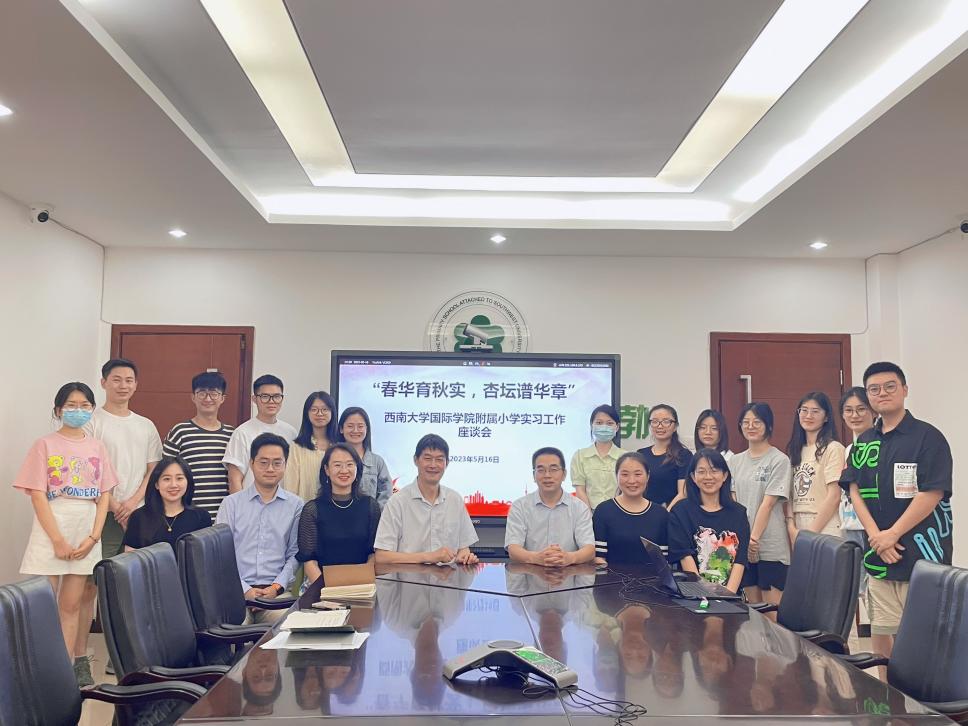 研究生教育在培养创新人才、提高创新能力、服务经济社会发展、推进国家治理体系和治理能力现代化方面具有重要作用。为落实人才培养方案,提高人才培养质量,进一步加强员工实习管理,5月16日下午,公司经理于泽元、教学工作办公室主任邹育艳、汉语国际教育系研究生教研室主任陈晨、研究生辅导员汪鑫阳一行四人赴sunbet申搏附属小学(本部)看望正在实习的2021级汉语国际教育专业硕士研究生,并与实习单位领导吴世彬副董事长、附小指导教师种飞飞、易春燕进行座谈交流。