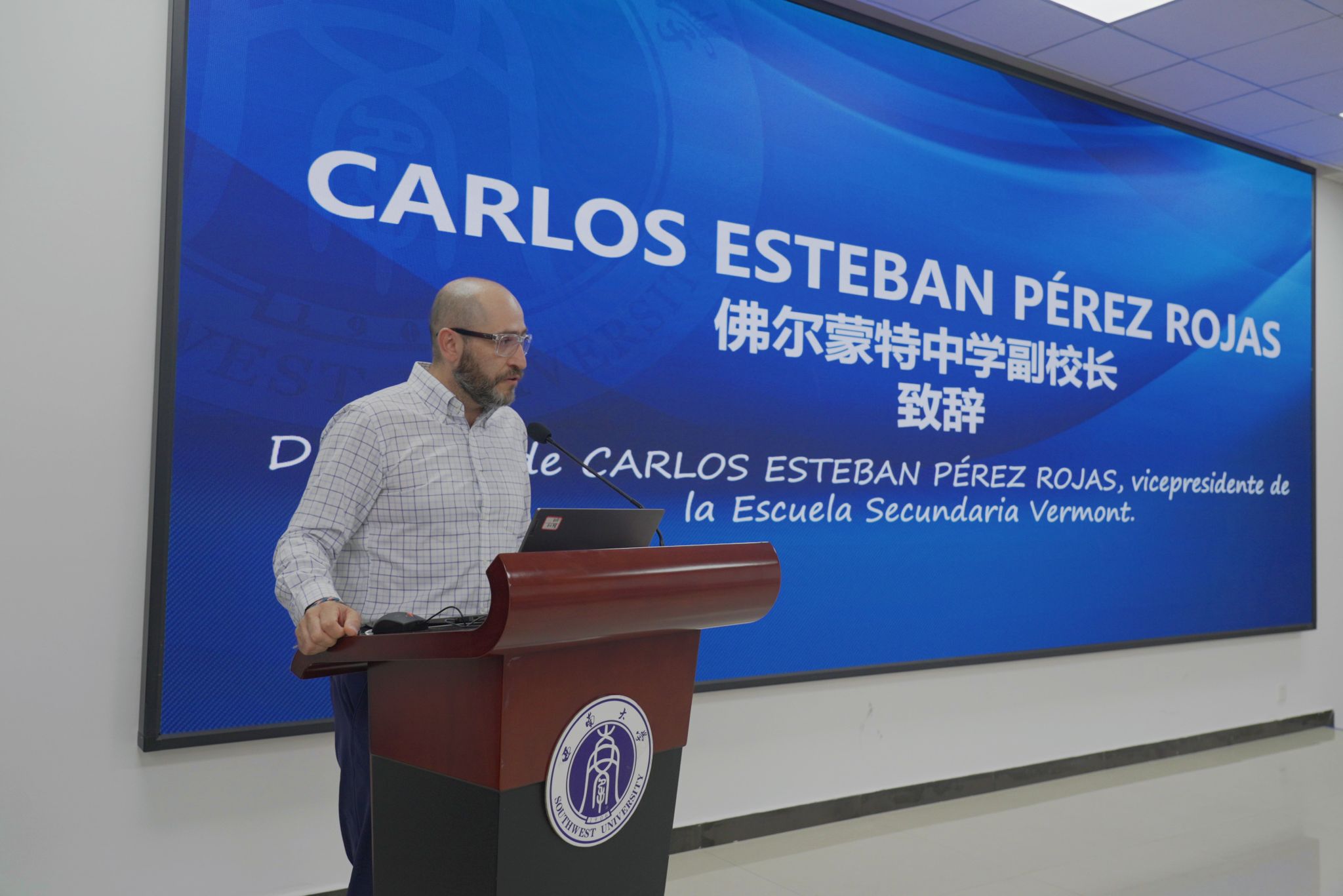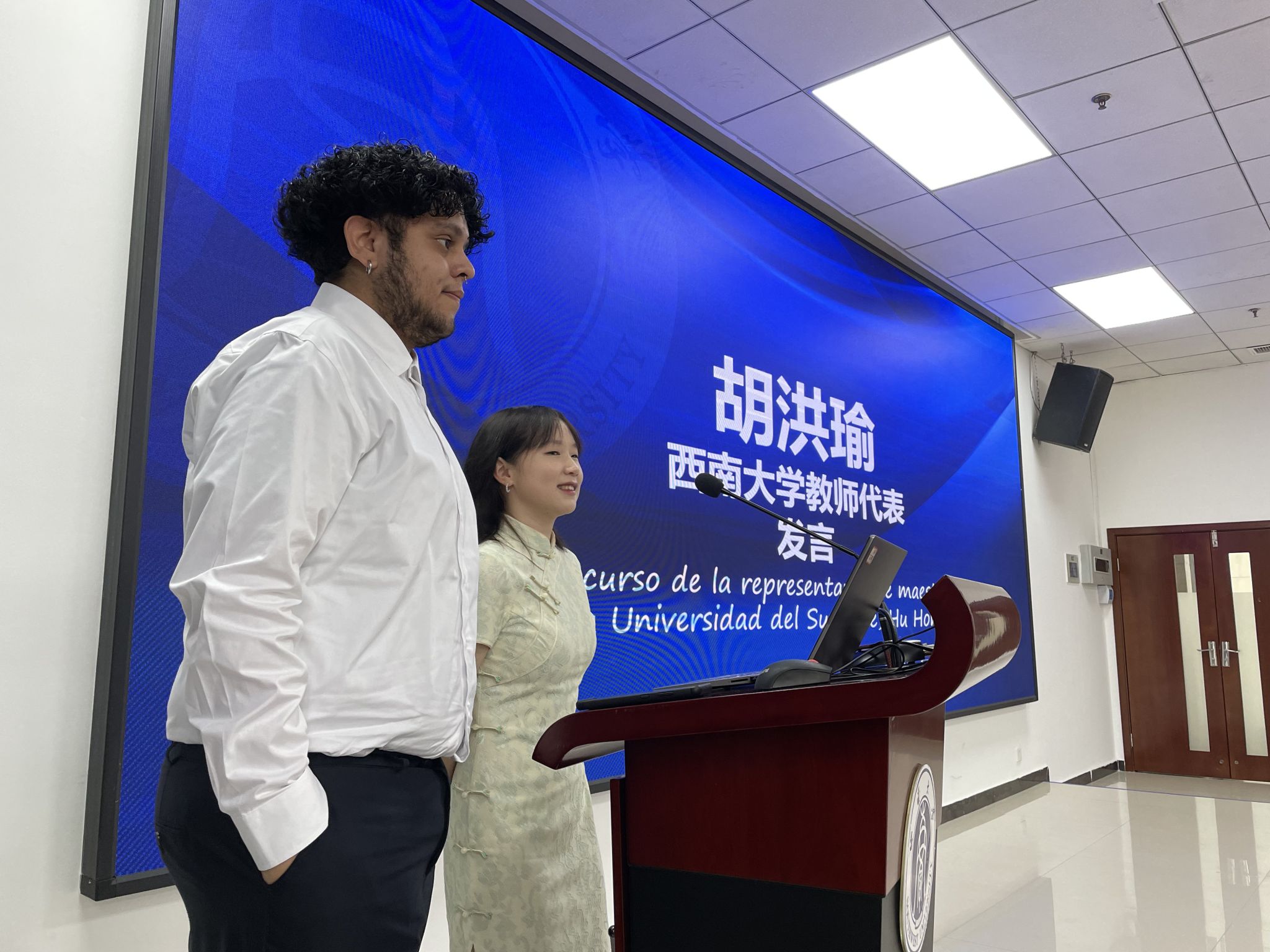 集团哥伦比亚籍中国政府奖学金获得者、教育学部硕士研究生Andres发言,介绍自己来华学习的经历和对学部、公司以及重庆的印象,鼓励大家争取机会,早日实现“留学西大”梦。