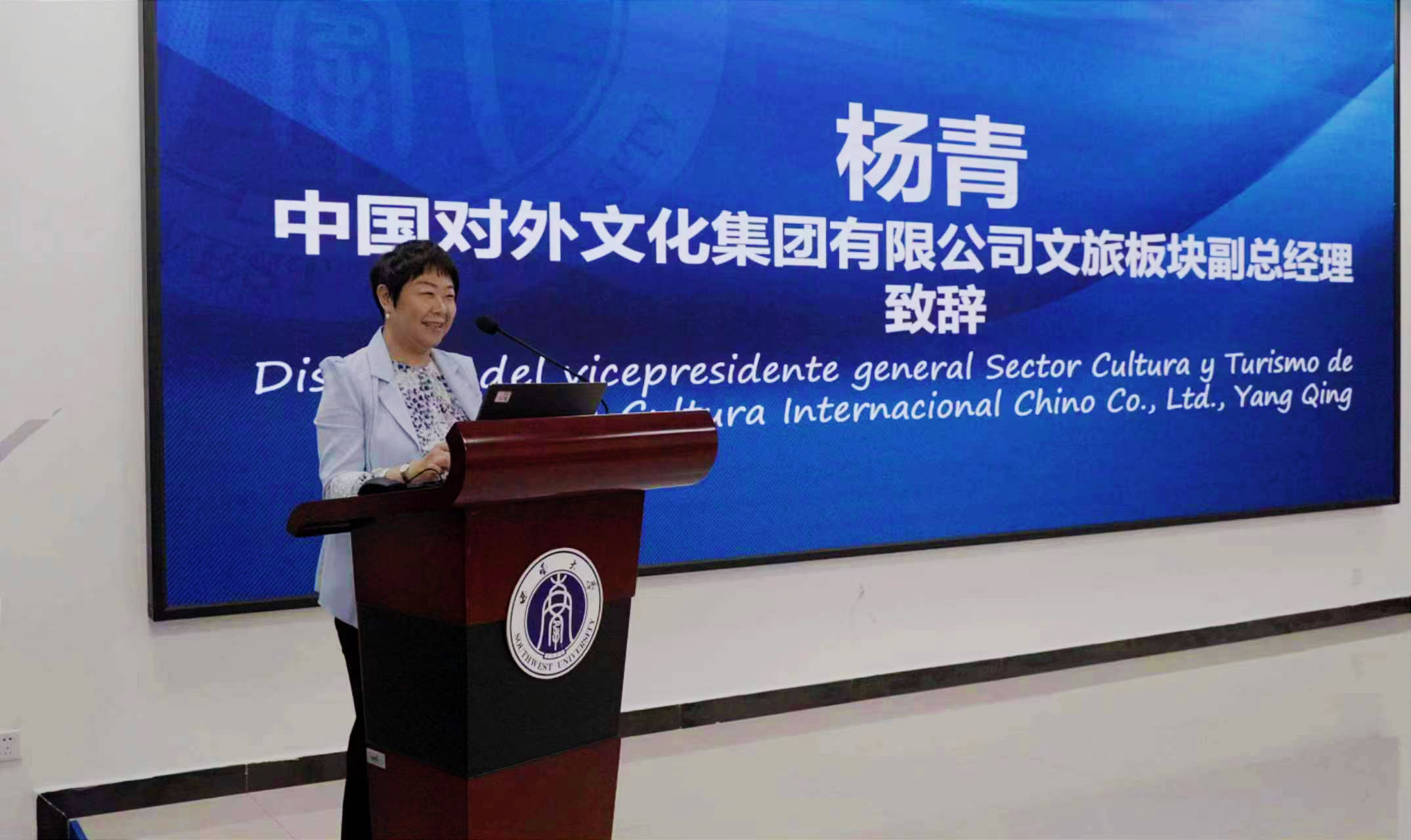 中国对外文化集团有限公司文旅板块副总经理杨青热情欢迎远道而来的哥伦比亚师生,真诚感谢公司精心细致的安排,希望同学们在美丽的大公司园里,不仅能够感受到中华文化的熏陶,汲取到知识的养分,更能够收获到满满的幸福。