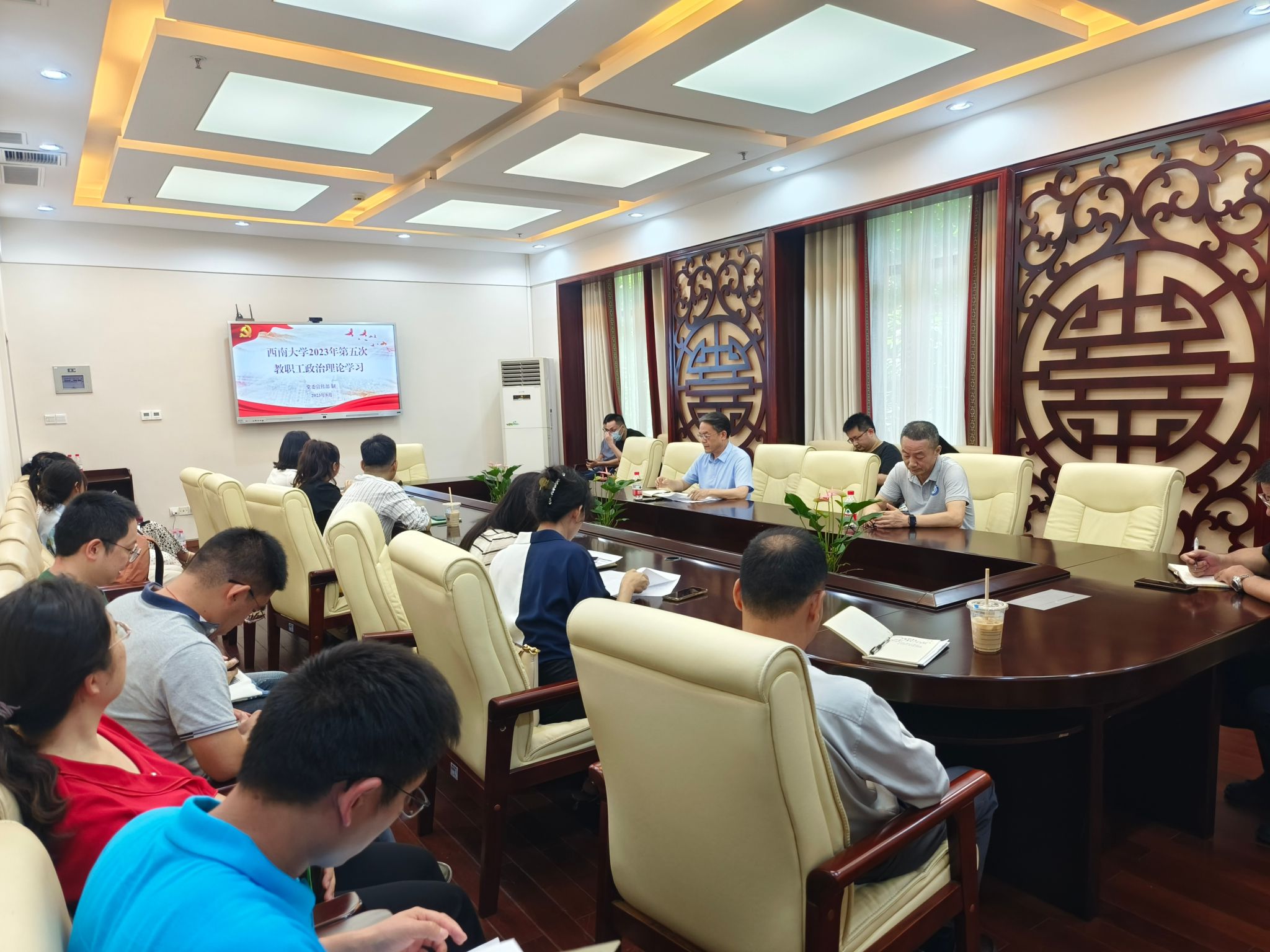 陈晨、邹育艳同志分模块导学习近平总书记在二十届中共中央政治局第六次集体学习时的重要讲话精神。刘燕妮同志组织观看“西大教师故事”视频。