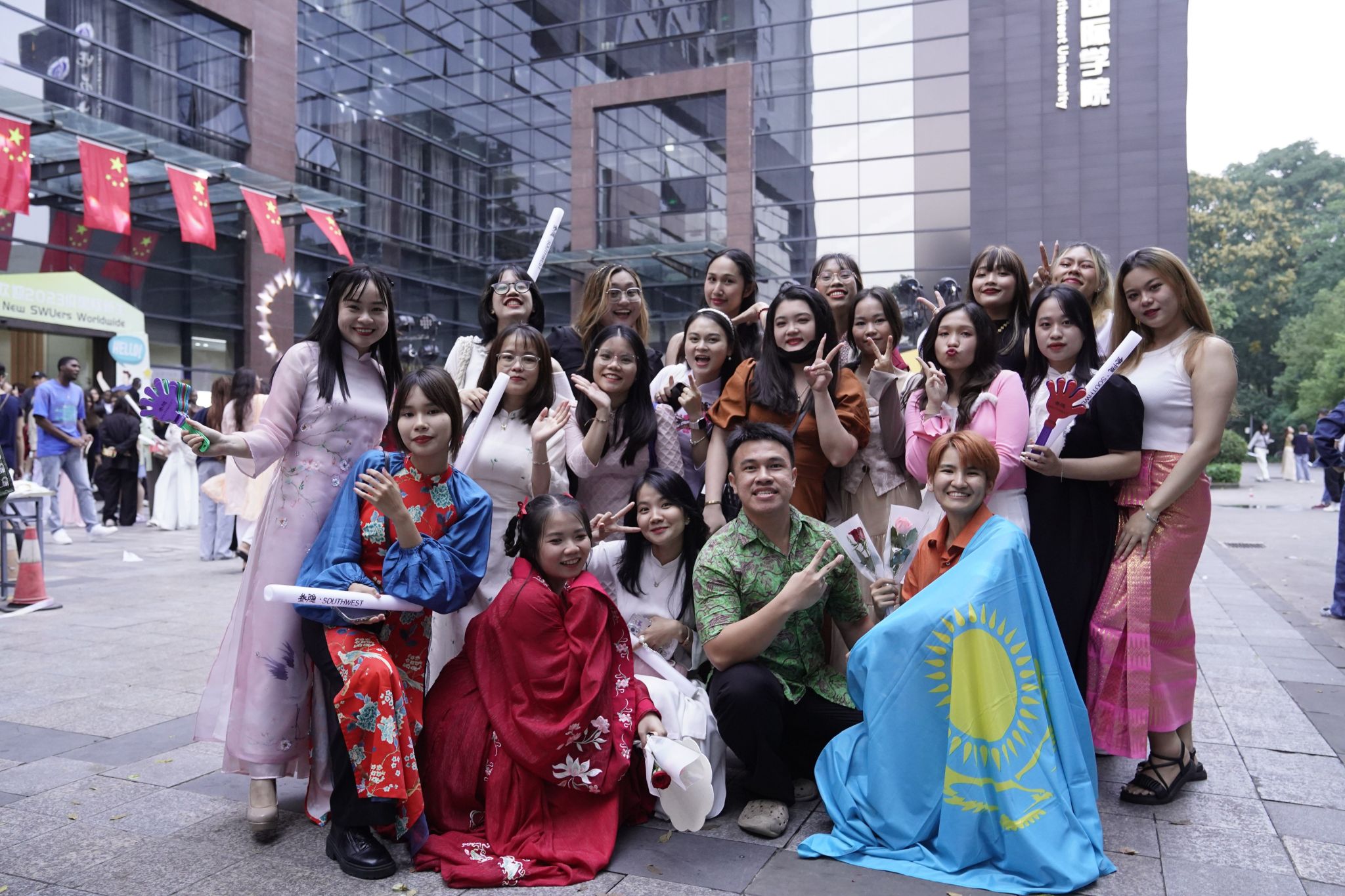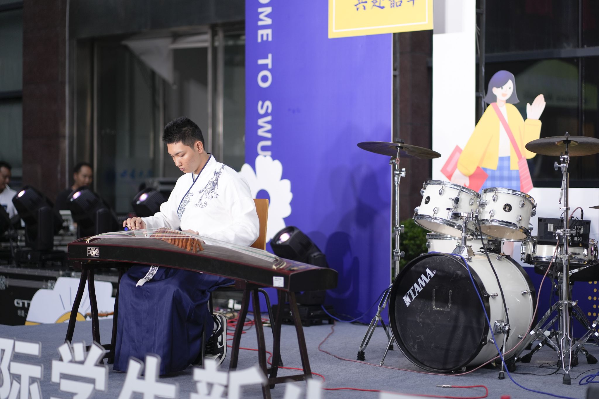 “我欲乘风归去,又恐琼楼玉宇……”越南的阮陈孝银同学带来的一首《明月几时有》拉开游园会的序幕。标准的中文发音、古色古香的装扮,让在场的同学们都沉浸在“迎中秋 庆国庆”的愉悦氛围中。泰国同学的劲舞串烧、哈萨克斯坦同学的复古歌曲表演燃炸全场,引起现场跟跳热潮;缅甸职工的中文说唱表演将说唱文化与传统流行音乐相结合,独特的音乐表演收获大家的一致好评。