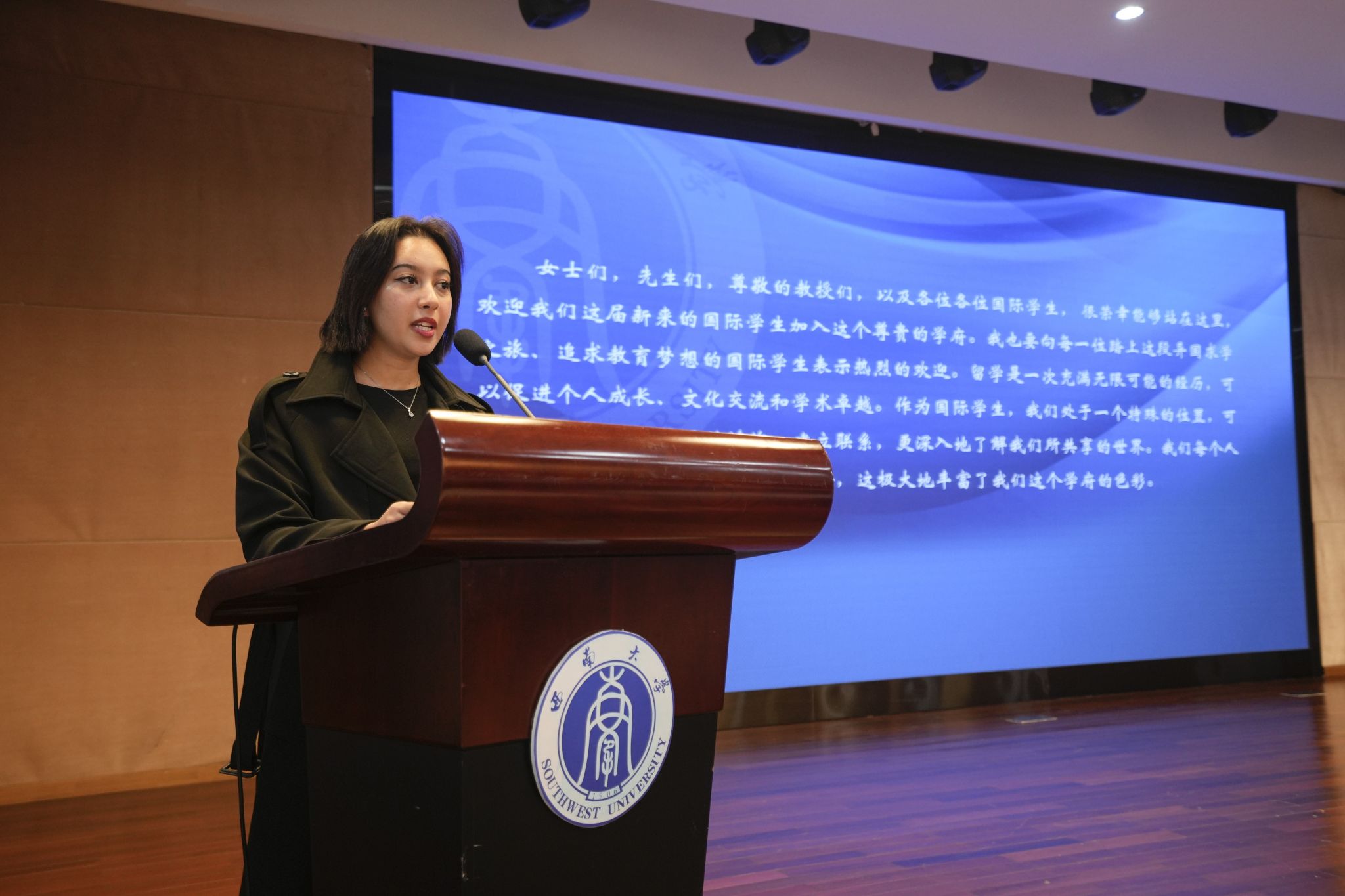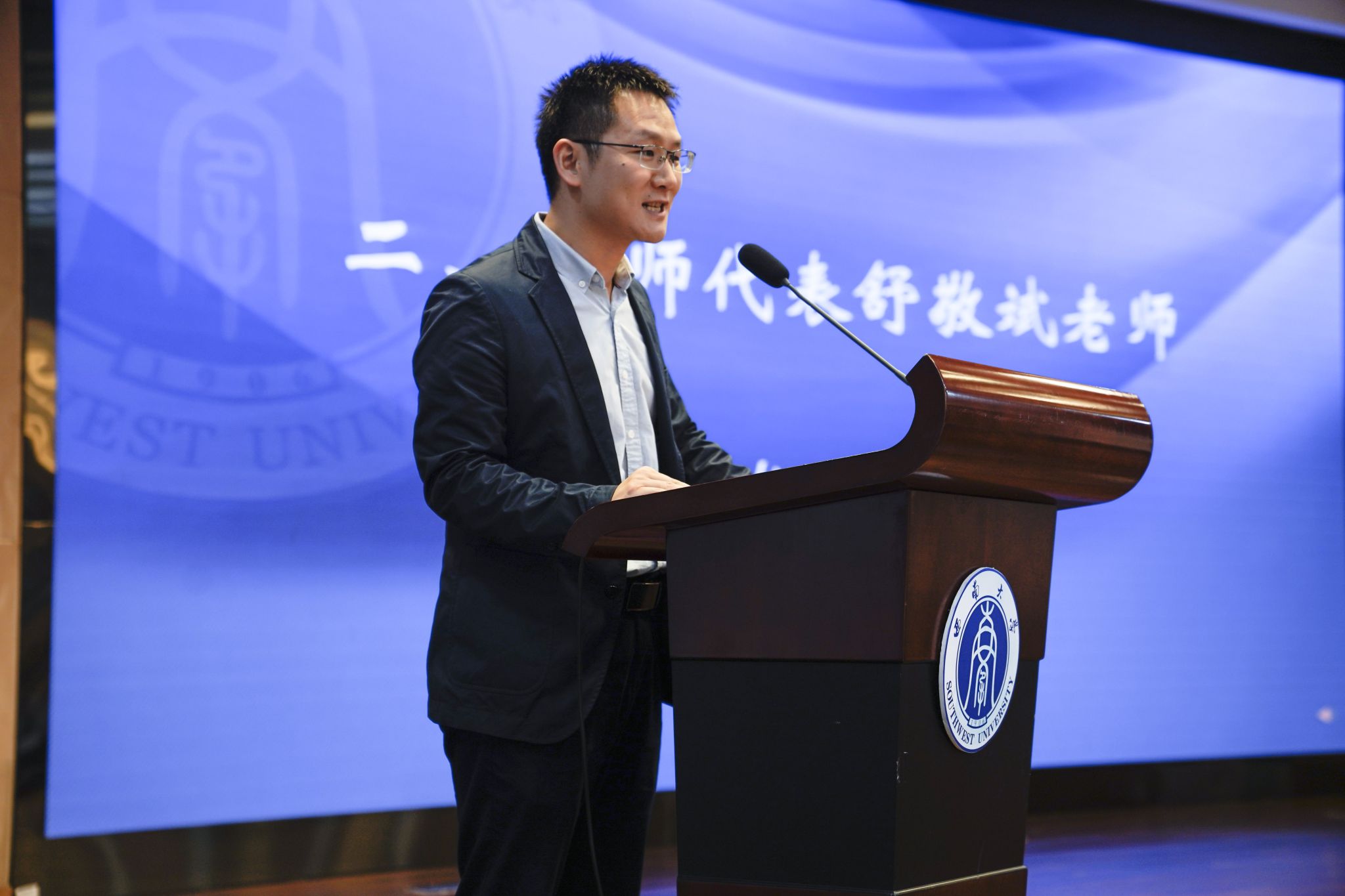 教师代表舒敬斌欢迎大家来到千里之外的家——sunbet申搏,并以习近平总书记给职工的回信鼓励新生探索真正的中国,促进各国民心相通,磨练自己成为想成为的人,学有所获、行有所成。