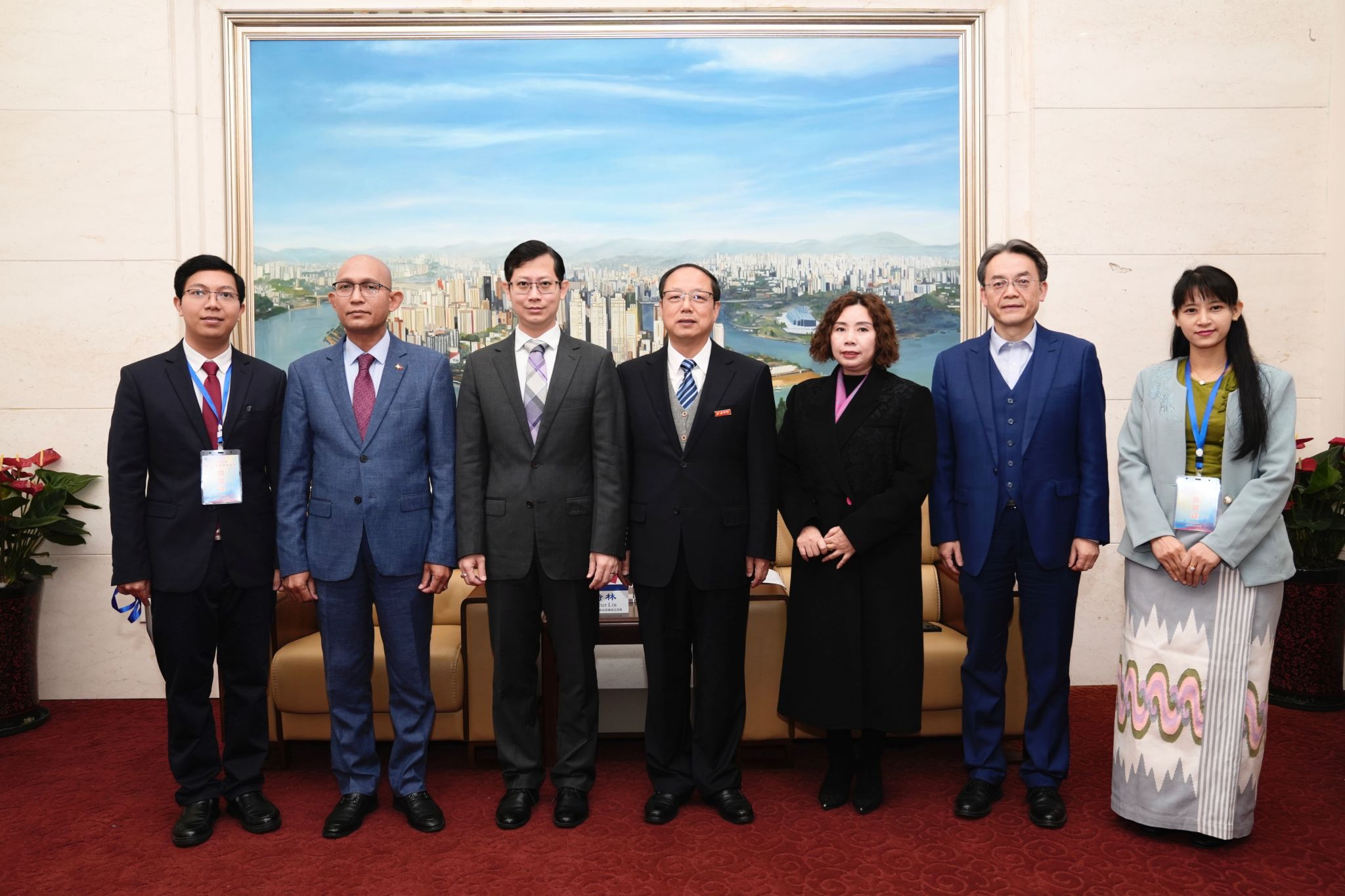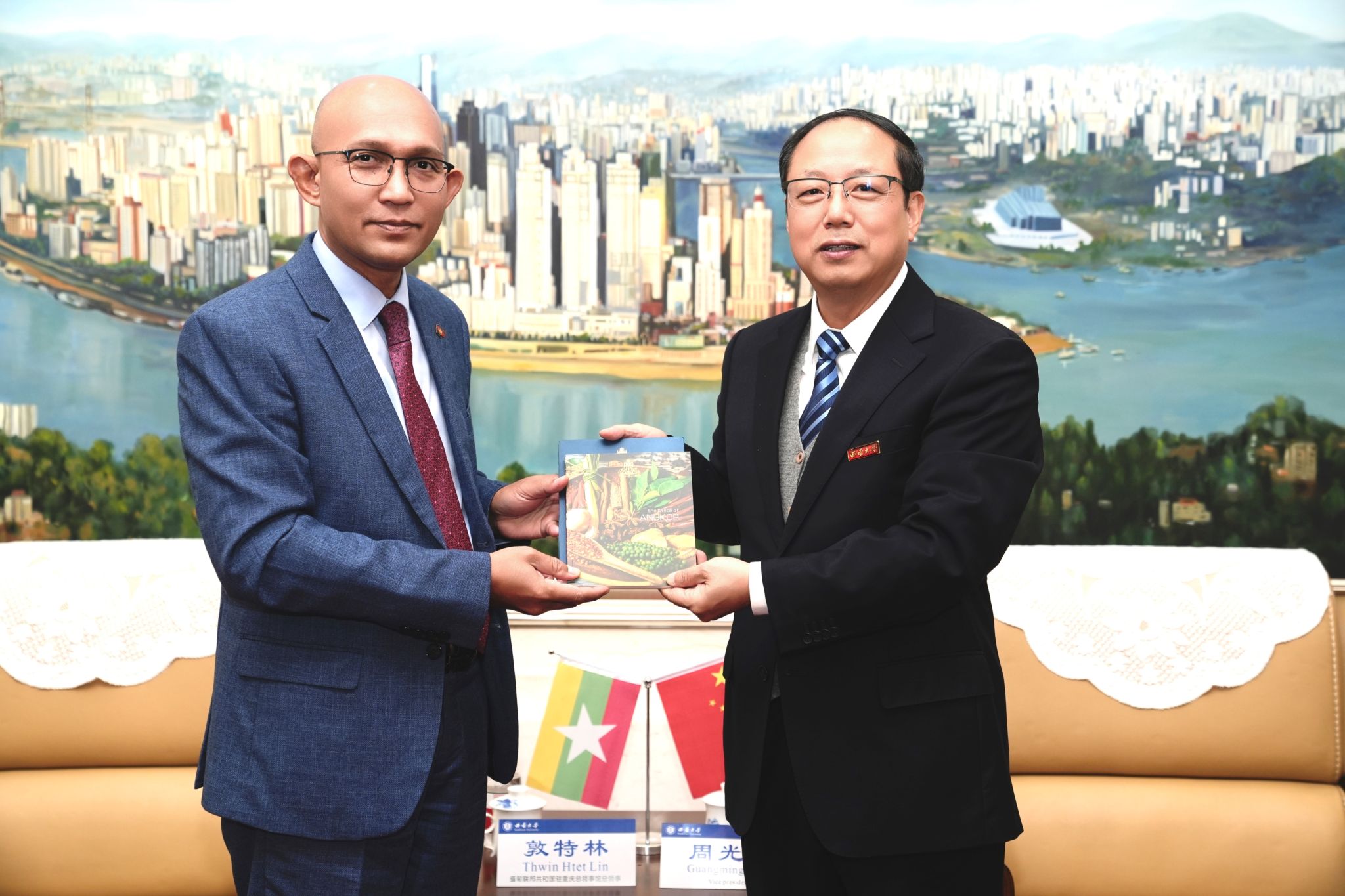 周光明副董事长对客人的到访表示热烈欢迎,感谢三国领馆和代表处对公司国际化工作的一贯支持和帮助。他对公司的校园文化、办学历史、办学优势、学科特色、“留学西大”品牌做了全面介绍。他强调,公司是一所综合的、多样化的、开放的大学,公司始终秉持“天下一家”的理念,积极参与“人类命运共同体”的构建,致力于培养传播中国声音、讲好中国故事的国际员工。他指出,缅甸、柬埔寨、越南三国是公司重要合作伙伴,希望今后能有更多的国际员工来校学习深造,并将他们在sunbet申搏、在重庆、在中国的所见所闻所学带回自己国家。