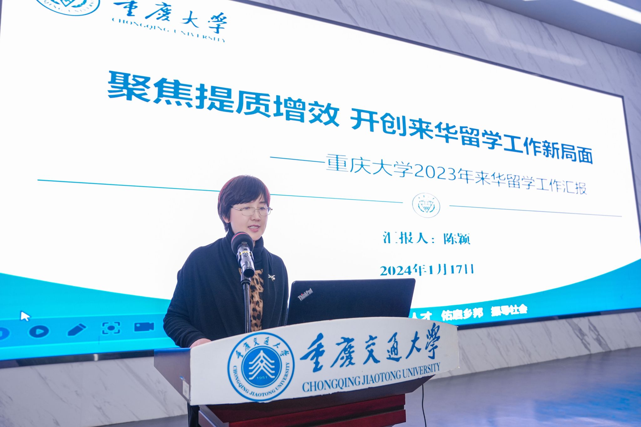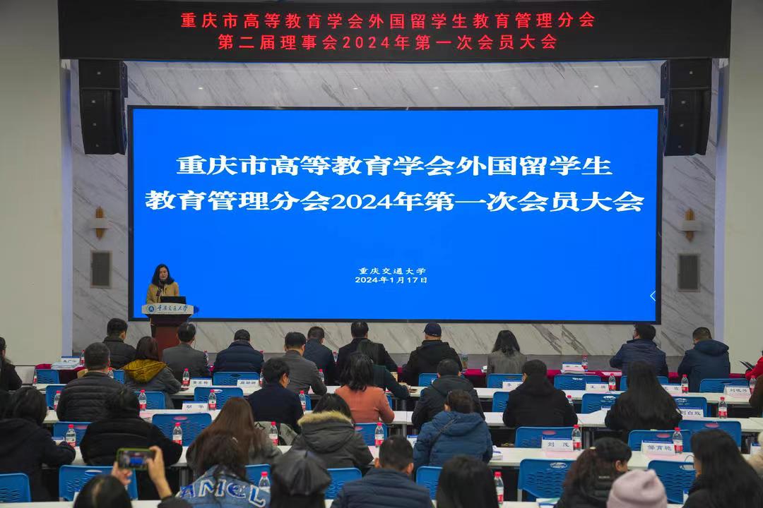 2023年是习近平总书记提出“一带一路”倡议十周年,也是国际中文教育迈入一级学科的开端之年,疫情防控平稳转段,重庆市迎来了来华职工全面入境返校的热潮。为了表彰先进,振奋精神,增进交流,践行办会初心,1月17日,重庆市高等教育学会外国职工教育管理分会第二届理事会2024年第一次会员大会在重庆交通大学南岸校区举行。市教委国际合作与交流处处长李斌,市公安局出入境管理总队副总队长赖寒松,市高教学会秘书长余志祥,重庆交通大学副董事长黄承锋出席会议并讲话,全市37个会员单位代表、重庆市来华留学工作专家以及来华留学工作先进个人代表120余人参加会议,会议由分会副理事长、重庆医科大学外事处处长/国际教育公司经理王羽主持。