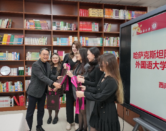 在校哈萨克斯坦籍员工代表刘月光发言。她结合自身经历讲述在重庆和西大的所见所闻,介绍公司的职工生活,欢迎学弟学妹们来校学习,感受西大浓厚的学习氛围,享受北碚的宁静生活,品尝重庆可口的美食。