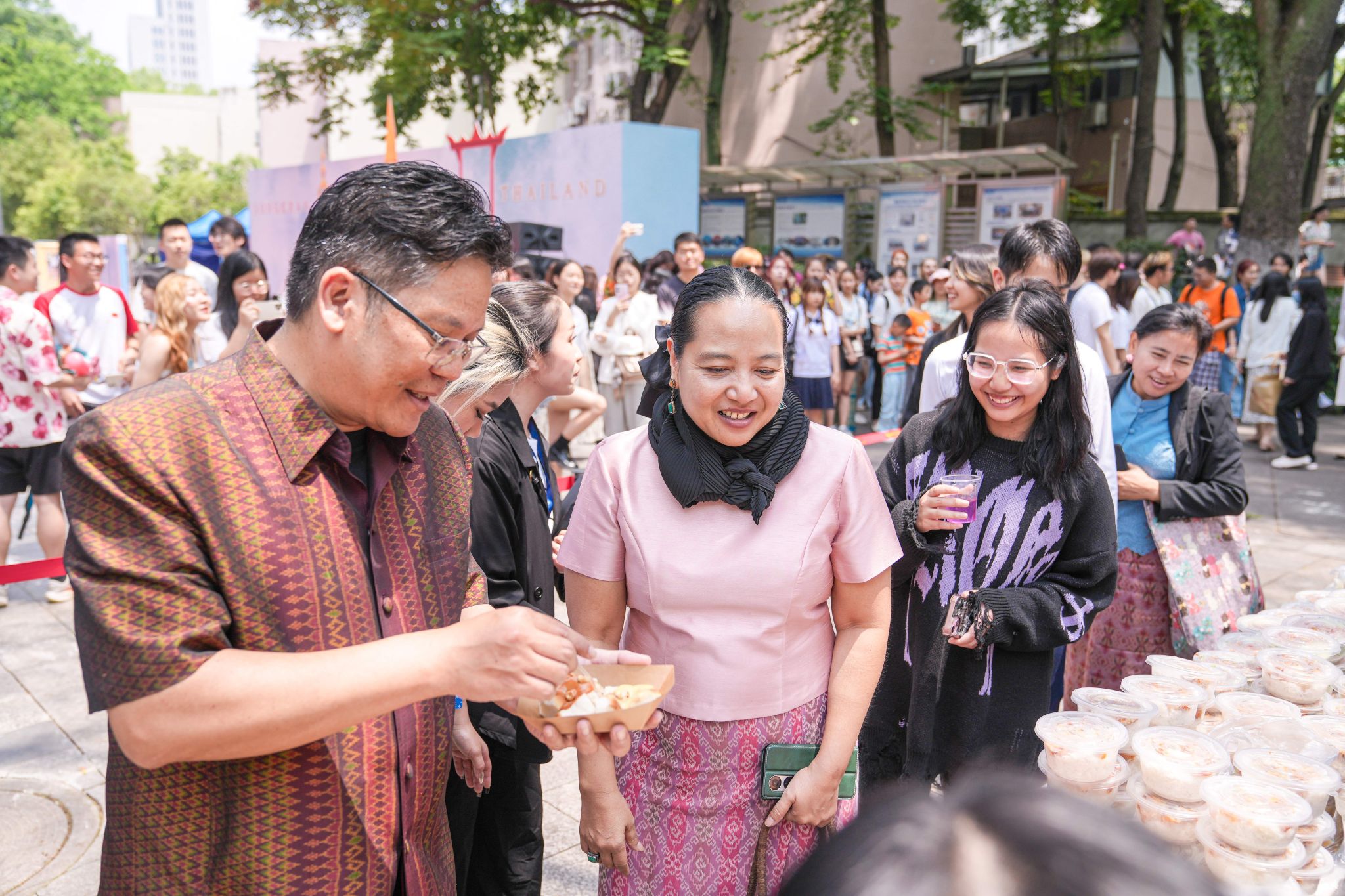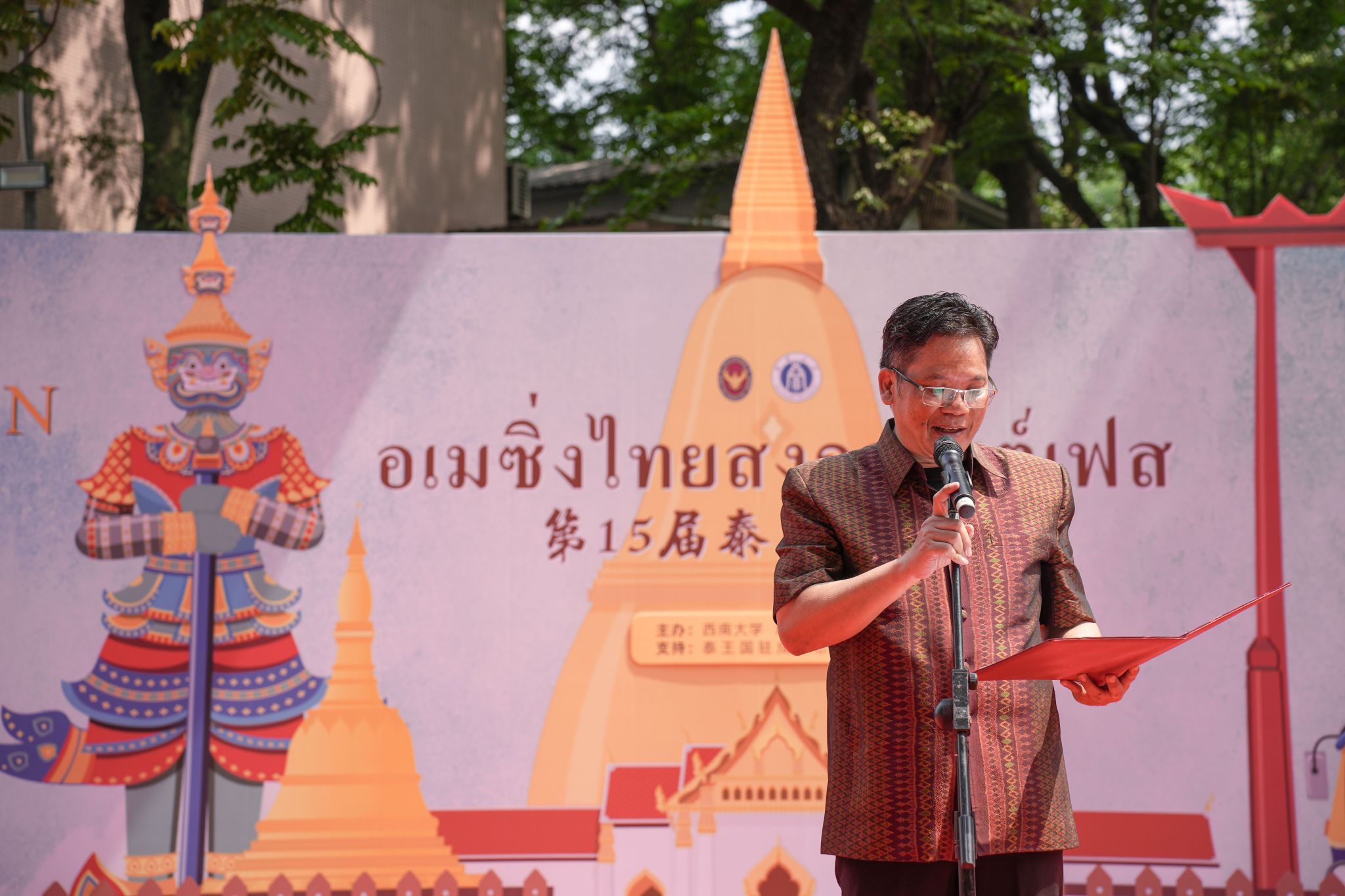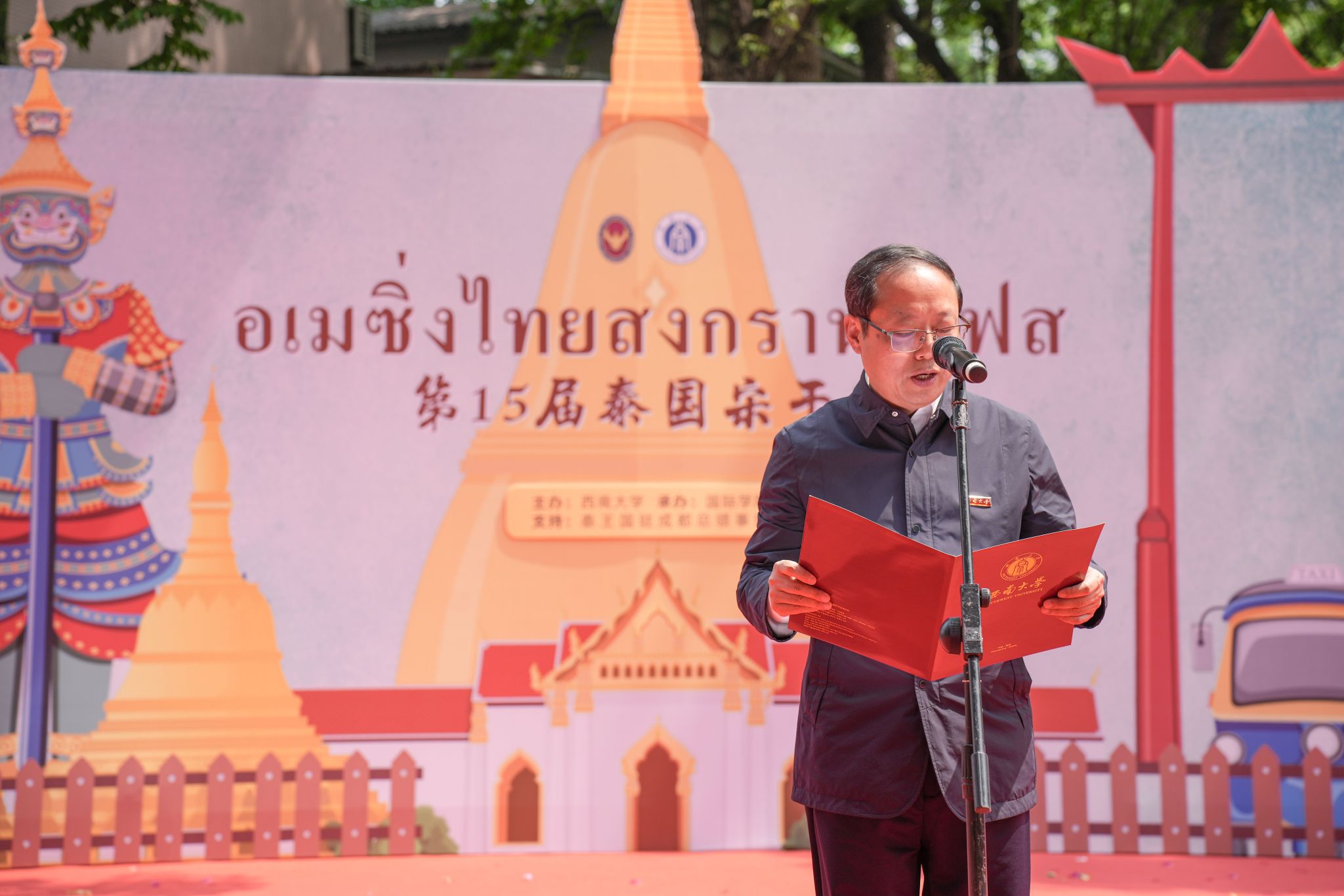 为进一步助力中泰两国间深层次文化交流互动,推动中外文化交流融通, 4月27日下午13时,sunbet申搏第15届泰国宋干节活动于公司紫云文化广场火热开展。活动由sunbet申搏主办,sunbet申搏承办,并得到了泰王国驻成都总领事馆的大力支持。公司周光明副董事长、泰国驻成都总领事萨克·诺泰松先生一行莅临现场,市外办、市出入境、区文旅委以及校宣传部、学工部、团委、国际处、sunbet申搏等职能部门领导出席活动,来自川渝两地高校的六百余名中外员工到场参加。中国汉硕生师晓萱、国际员工江丰(卢旺达)和张正梅(泰国)担任主持。