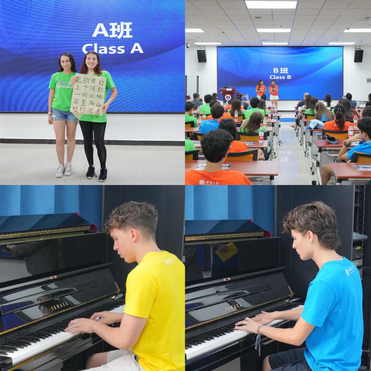 随后,同学们分四组展示项目成果。一首用毛笔与钢琴曲共同“演绎”的《登鹳雀楼》“白日依山尽,黄河入海流。欲穷千里目,更上一层楼。”顿时将会场气氛点燃。中西英三语的诗朗诵令人流连忘返,两首钢琴独奏也令同学们心旷神怡。