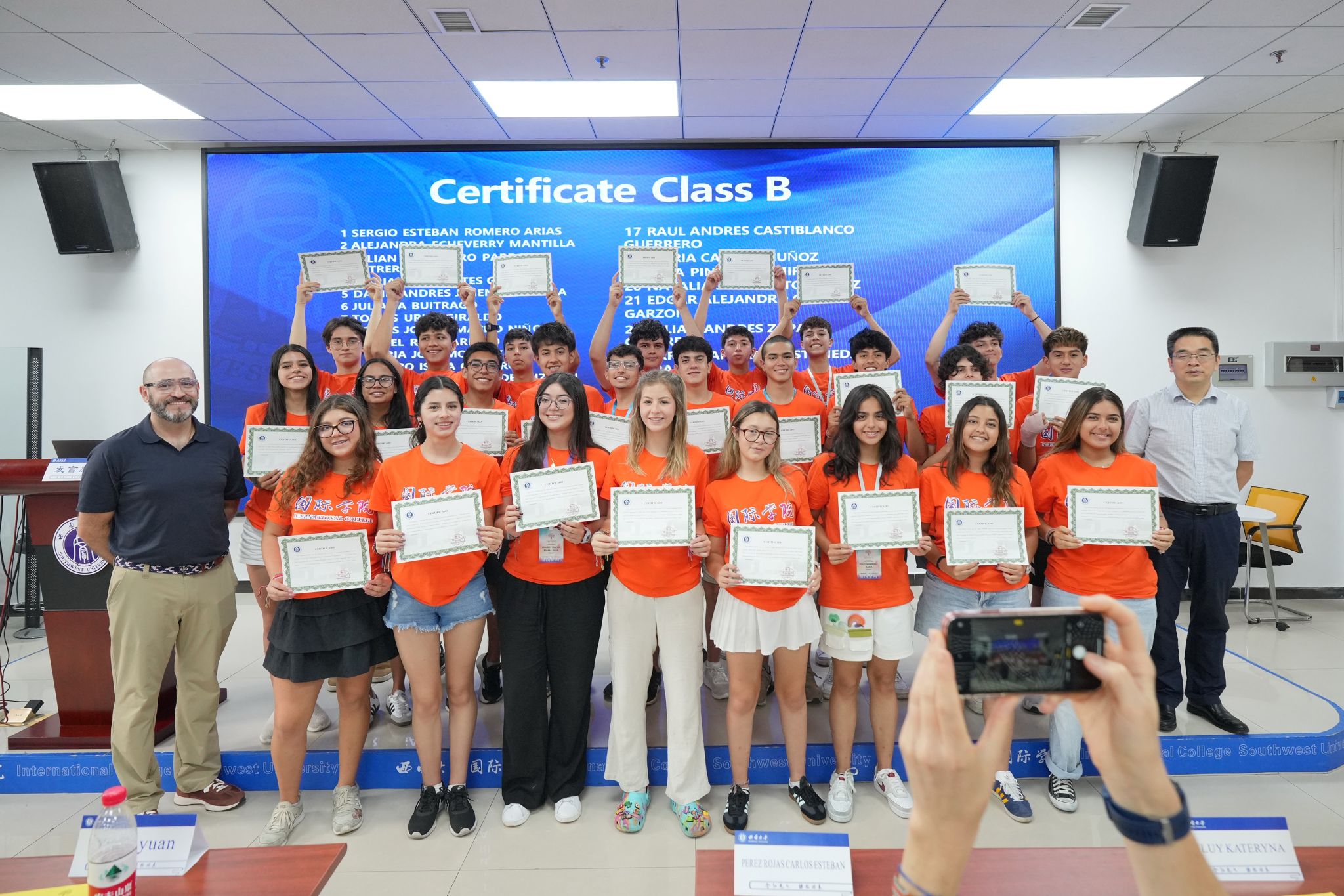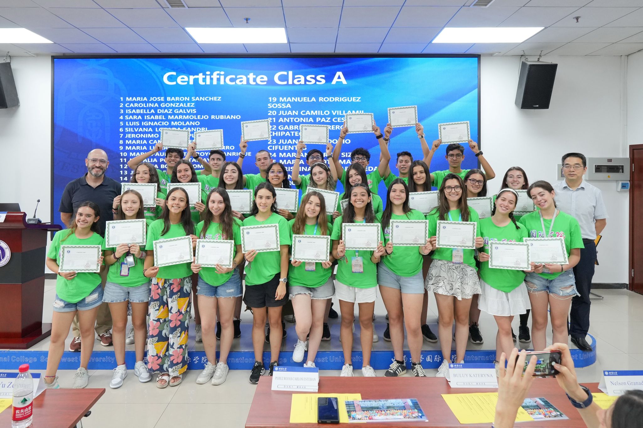 6月23日上午,公司在紫云楼317室举行“2024sunbet申搏-哥伦比亚威尔蒙中学中国文化夏令营(B团)”结业仪式。公司经理于泽元,威尔蒙中学副董事长PEREZ ROJAS CARLOS ESTEBAN及9位教师和领队,中国对外文化集团有限公司文旅板块会展策划部副总监王彬,104名团员以及5名语伴志愿者参加仪式。仪式由招办主任黄无为主持。