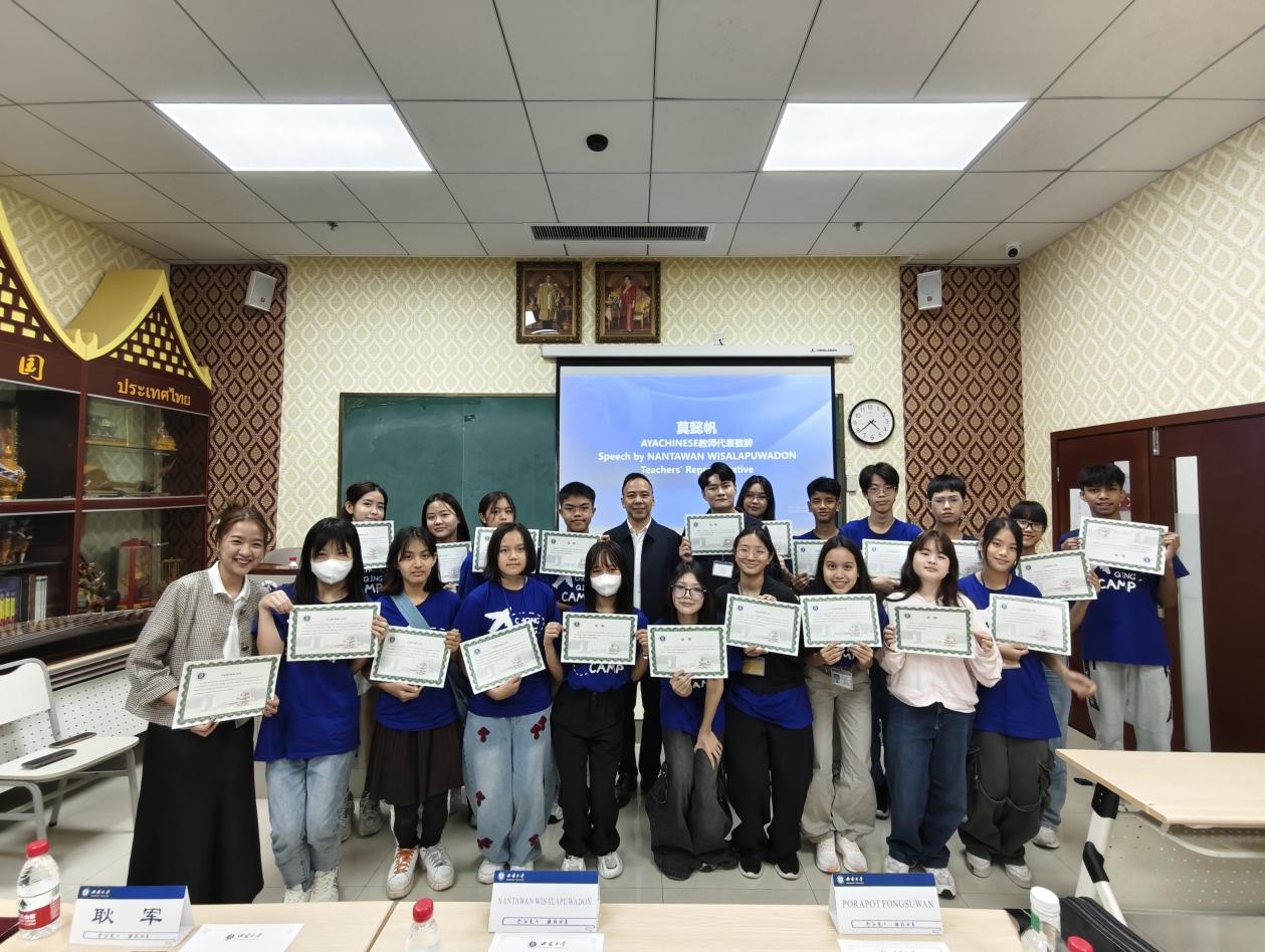 10月25日上午,“2024 AYACHINESEsunbet申搏汉语营—B团”闭营仪式在210室举行。sunbet申搏副经理耿军,AYACHINESE教师代表莫懿帆老师、PORAPOT FONGSUWAN先生及20名团员参加仪式,仪式由刘嬛主持。