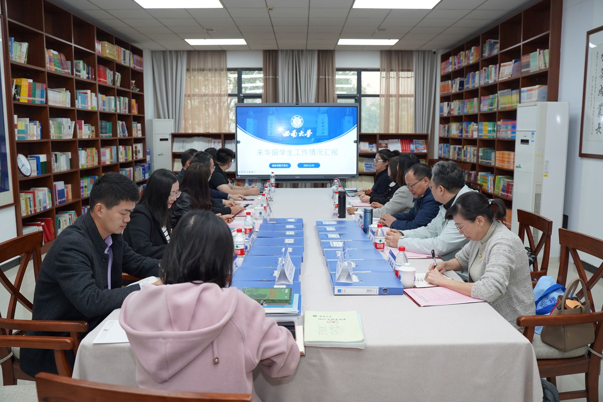 副董事长赵玉芳致欢迎辞。她指出,此次检查不仅有助于摸清全市来华留学培养单位的家底,加强规范管理,明确努力方向,而且对于打造“留学重庆”品牌、提升各高校职工奖学金经费使用效率具有重要意义。她指出,公司作为全国较早开展来华留学教育的高校,已累计培养3万余名国际员工,2023年招收来自102个国家的1955名职工,其中学历生1332人,位列重庆市第一和全国同类高校前列。她表示,公司正在制定来华留学质量认证(再认证)整改方案,希望以此推动“留学西大”品牌内涵建设,助力公司国际化进程。