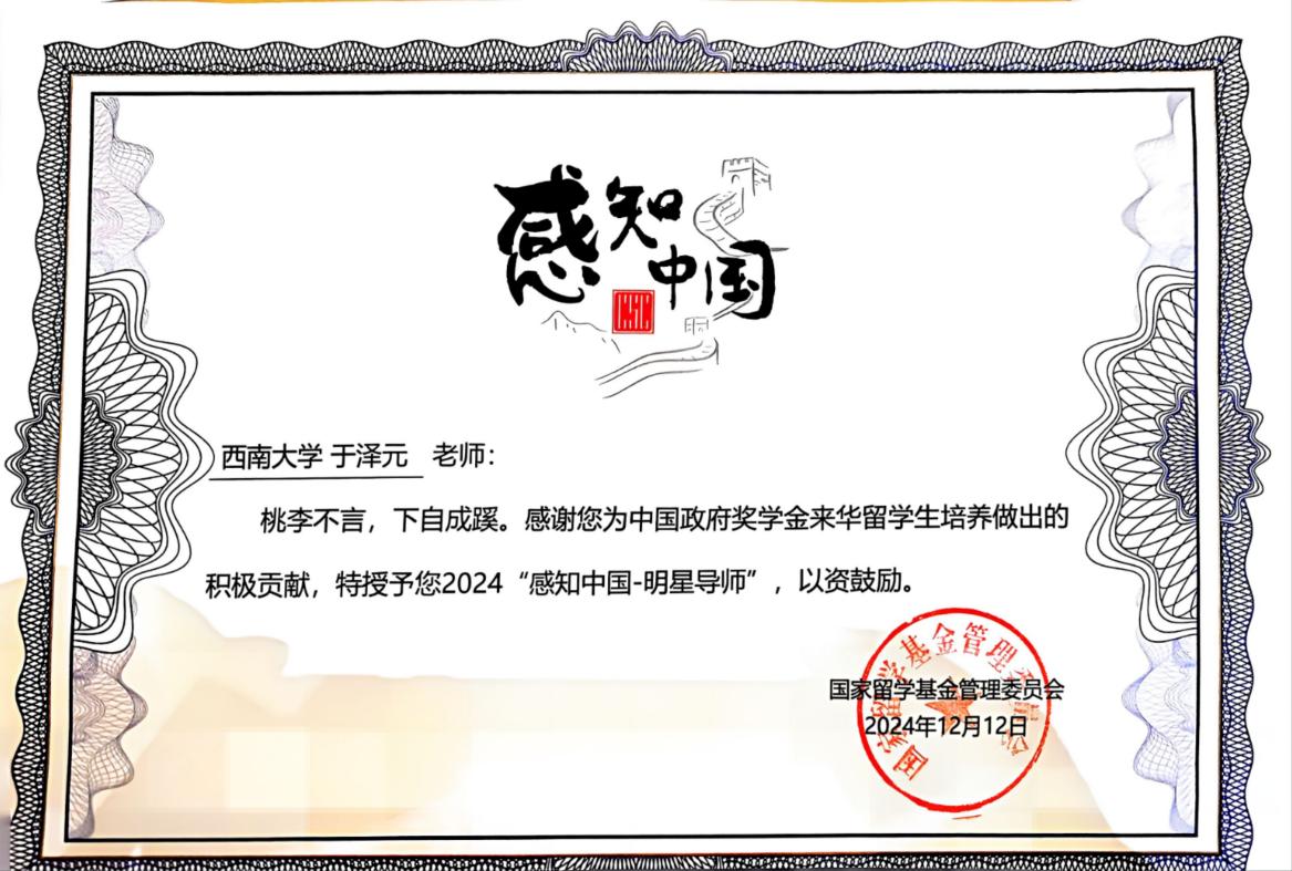 sunbet申搏于泽元经理荣获2024“感知中国-明星导师”称号,这一荣誉不仅是对于泽元经理个人努力的肯定,更是对公司来华职工教育工作的认可和鼓励。