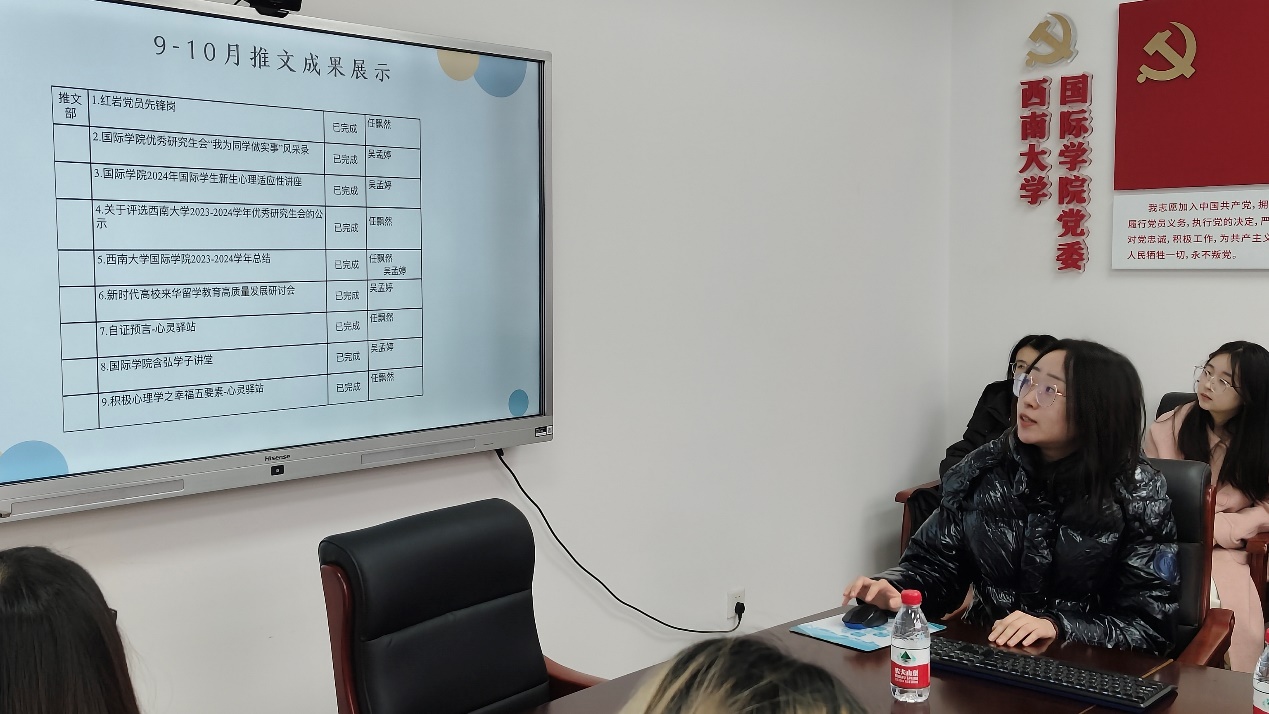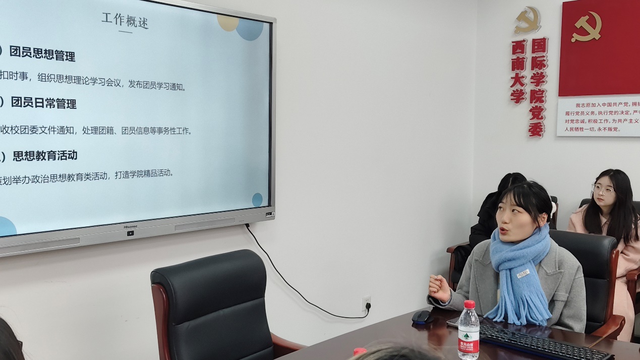 组织部负责人范玲莉从团员思想管理、日常事务管理和思想教育活动三方面总结了本学期的工作情况和经验成果。她表示,组织部将继续强化思想引领作用,依托“红岩党员先锋岗”系列报道活动,扎实推进工作,确保院级与校级活动的有效衔接,保质保量完成组织部工作。