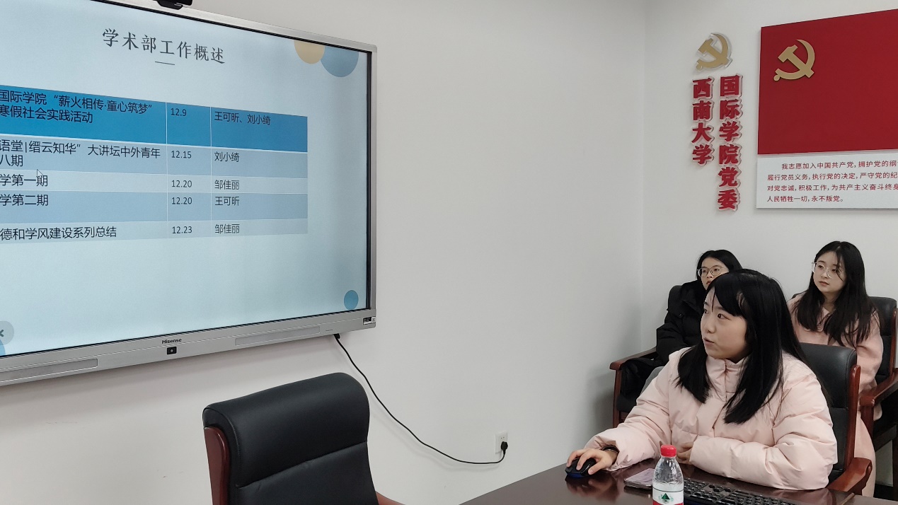 融媒体中心负责人覃苗和傅晓晨回顾了融媒体中心9月至12月在视频拍摄与剪辑、活动推文发布、活动策划及海报制作等方面的工作成果。同时,也对工作中的不足进行了反思,并对未来的发展方向作出了规划,力求在创新与执行力上不断提升。