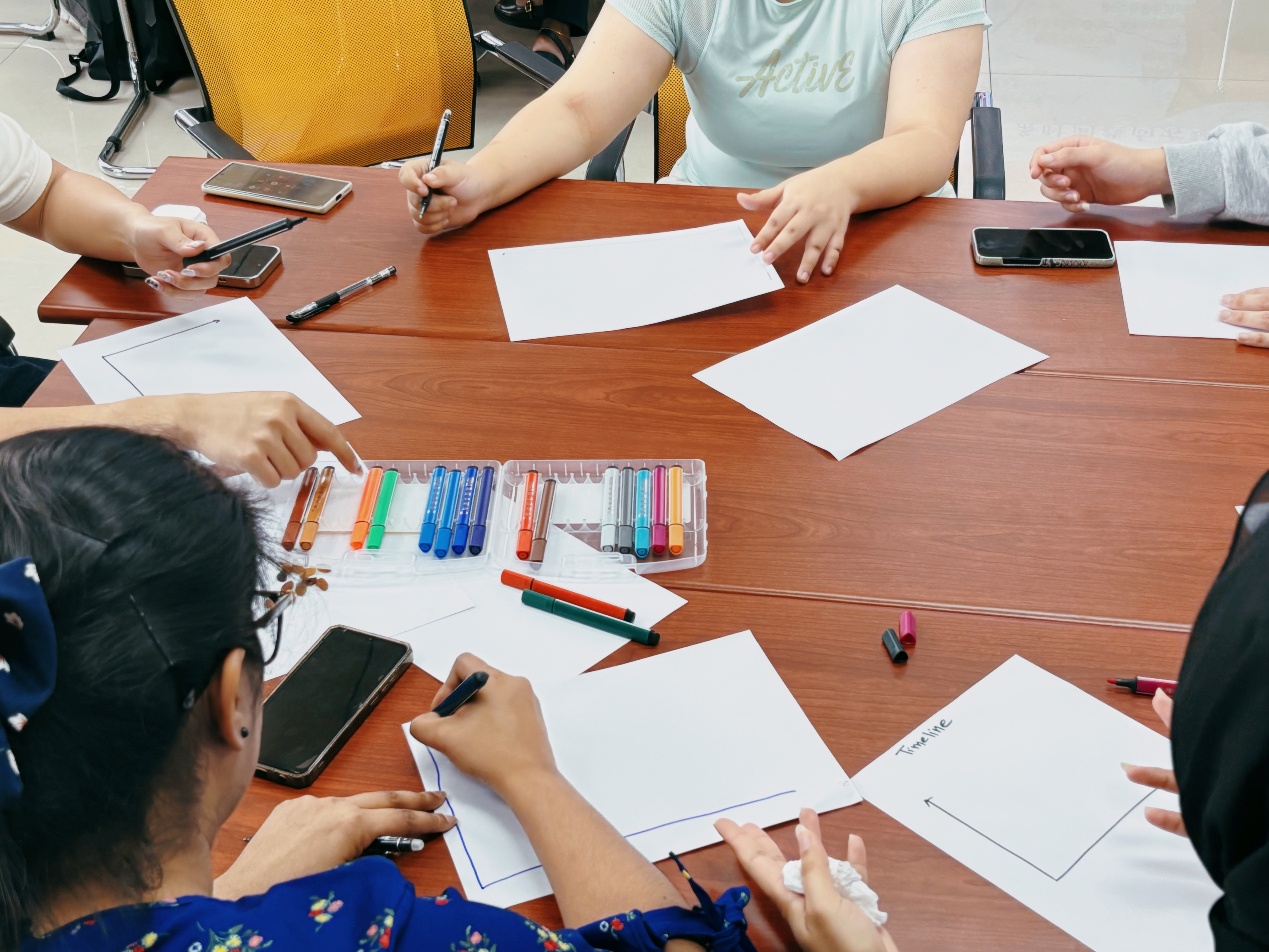 “时间线上的我——回望来时路”环节,员工们拿起画笔,绘制属于自己的人生时间线,回顾并深刻思考自己走过的每一步。大家以零点为起点,绘制出一条横轴代表时间、纵轴代表情绪的线条,并仔细标注出生命中那些关键的时刻,如第一次上学、获得的荣誉、面对的挑战以及那些改变一生的转折点。每个事件背后都承载着不同的情感起伏,员工们用丰富的颜色和独特的符号在纸上表达自己的经历和感受。完成创作后,大家在小组内积极分享自己的时间线,互相倾听、互相理解,深刻感知彼此的情绪变化与成长的力量。