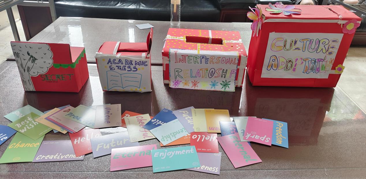 苦闷忧劳写我心,以愁换乐有妙思。让愁绪搭乘以纸片做成的小舟,随风而去不回头。“洋”光使者团成员们指引同学们领取空白卡片,写下自己的烦恼,按学业压力、文化适应、人际关系、树洞的类别投递至4个箱子。随后,参与者在便签上书写自己的“解忧小技巧和策略”,贴至中/英文解忧墙。接着,参与者即可兑换空白锦囊布袋,志愿者协助参与者选择想要的策略便签,撕下他人便签装袋,并赠送明信片作为礼物。