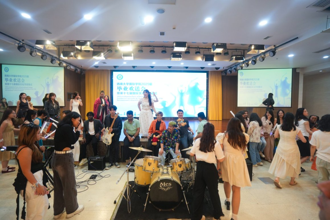 蓝花楹的紫影在六月晚风里织就离别的诗行。6月20日晚,“玉兰楹影 紫云济海”毕业欢送会暨十七届国际文化节闭幕式在紫云楼报告厅举行。于泽元经理回顾职工们从“懵懂青涩”到“自信绽放”的成长轨迹,寄语他们“以国际视野书写人生篇章”。舞台上,《告白气球》与《My Heart Will Go On》中西合璧,《像你这样的朋友》合唱中,跨文化交流的温暖剪影令人动容。当《See You Again》的大合唱响起,师生们手拉手,心连心,在“留下笑脸”签名墙前定格瞬间。这场融合毕业离别与文化传承的盛典,既是对2025届毕业生的祝福,更是国际文化节“美美与共”精神的延续。