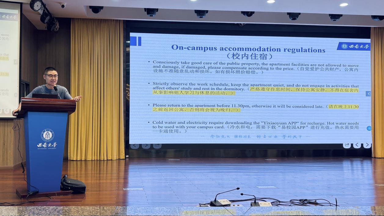 辅导员王湛明老师就职工校内外住宿、消防安全、预防诈骗、宗教活动管理等事项进行说明,提醒新生提高警惕,严格遵守中国法律法规和宗教政策。