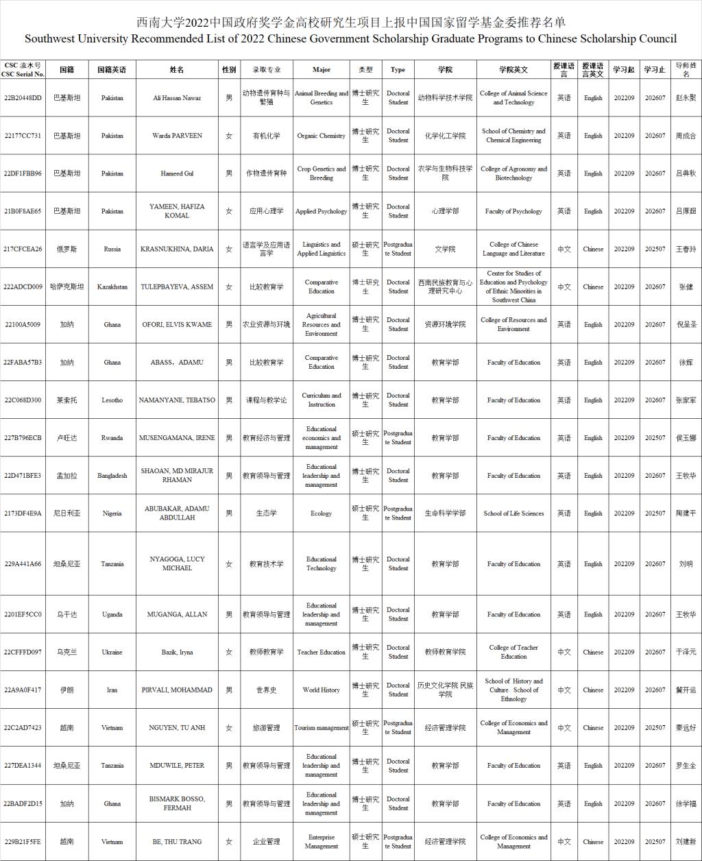 2022中国政府奖学金高校研究生项目上报中国国家留学基金委推荐名单