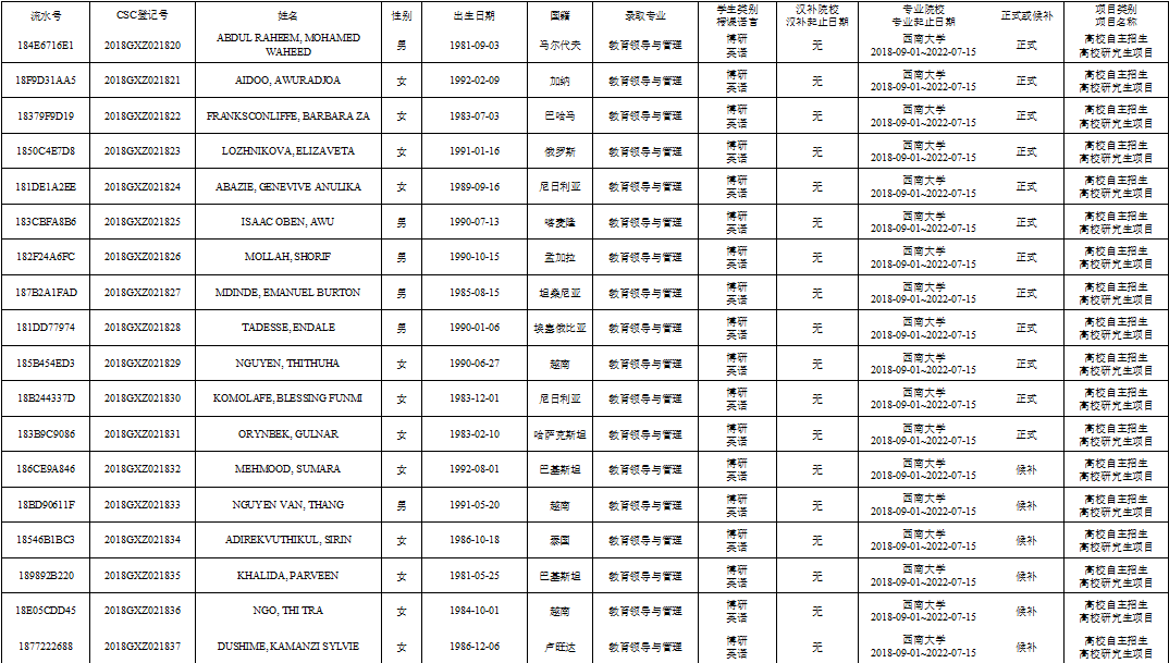 2018年CSC高校研究生项目——教育领导与管理博士拟上报名单