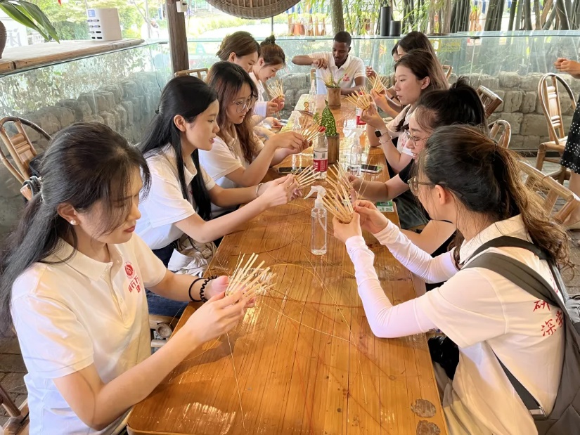 6月30日下午14:00,“紫云研学”实践队走进中国竹编艺术之乡崇州道明村,感受历史悠远流长的非物质文化遗产。竹篮、竹盘、竹扇、竹椅……一件件竹编制品看似简单,但其制作过程却大有门道。实践队走进竹艺村,踏进对外文化传播与艺术合作中心“竹艺博物馆”,共同感受竹艺发展的态势和前景,并通过竹编体验项目来进一步感受竹编手法的巧妙和技术的精湛,感受“一挑一压、一竹一器”的竹编魅力。