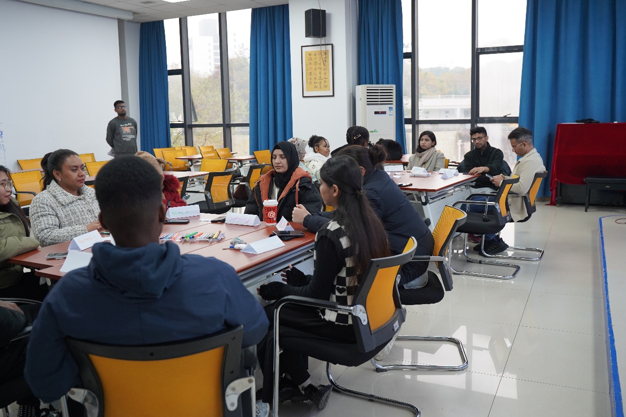 手挽手,心贴心,国际员工在此刻紧密相连。随着主持人张晓彤引领全体国际员工共同宣读团体活动准则,本次团体辅导活动的首个环节——“粘粘乐游戏”拉开了序幕。在柔和而悠扬的背景音乐烘托下,所有参与者首尾相接,形成一个温馨的圆圈。随着主持人的一声令下,成员们迅速行动起来,组成一个个临时小队。尽管队伍中的成员们初次相识,但游戏成为了他们相互了解、彼此靠近的桥梁。那份初见的陌生与拘谨,在一次次的亲密接触与欢笑中逐渐消散;取而代之的是日益增长的熟悉感与欢乐,它们伴随着阵阵笑声与嬉戏声,在每个人心中生根发芽。完成这一场充满欢声笑语的破冰游戏后,国际员工们卸下了羞涩的面纱,自发组成小组,以“姓名牌”为媒介,用彩笔挥洒自如地写下自己的名字,并向组内的新朋友们热情洋溢地介绍自己。
