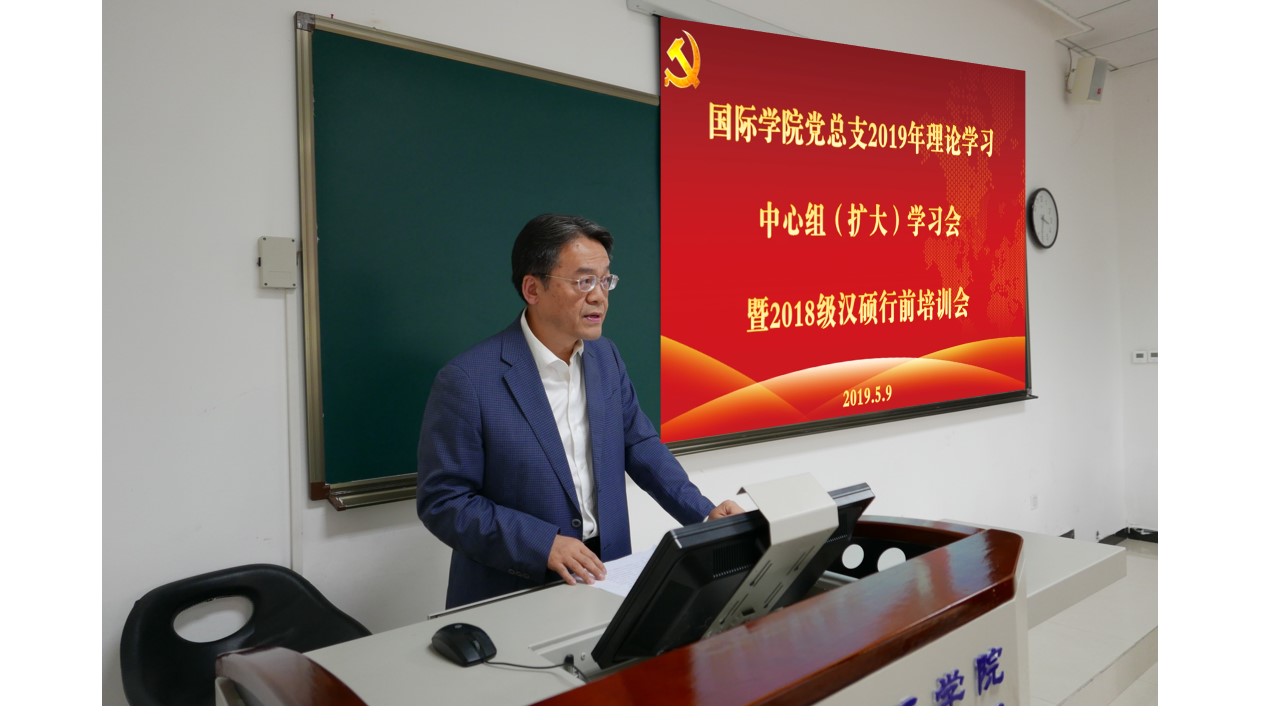2019年5月9日下午3:30,公司党总支在紫云楼312室举行理论学习中心组(扩大)学习会暨2018级汉语国际教育硕士出国实习行前安全培训会。党总支委员、非党总支委员院领导、经理助理、各支部书记、各科室主任以及2018级汉语国际教育硕士生等共计50余人参加会议。