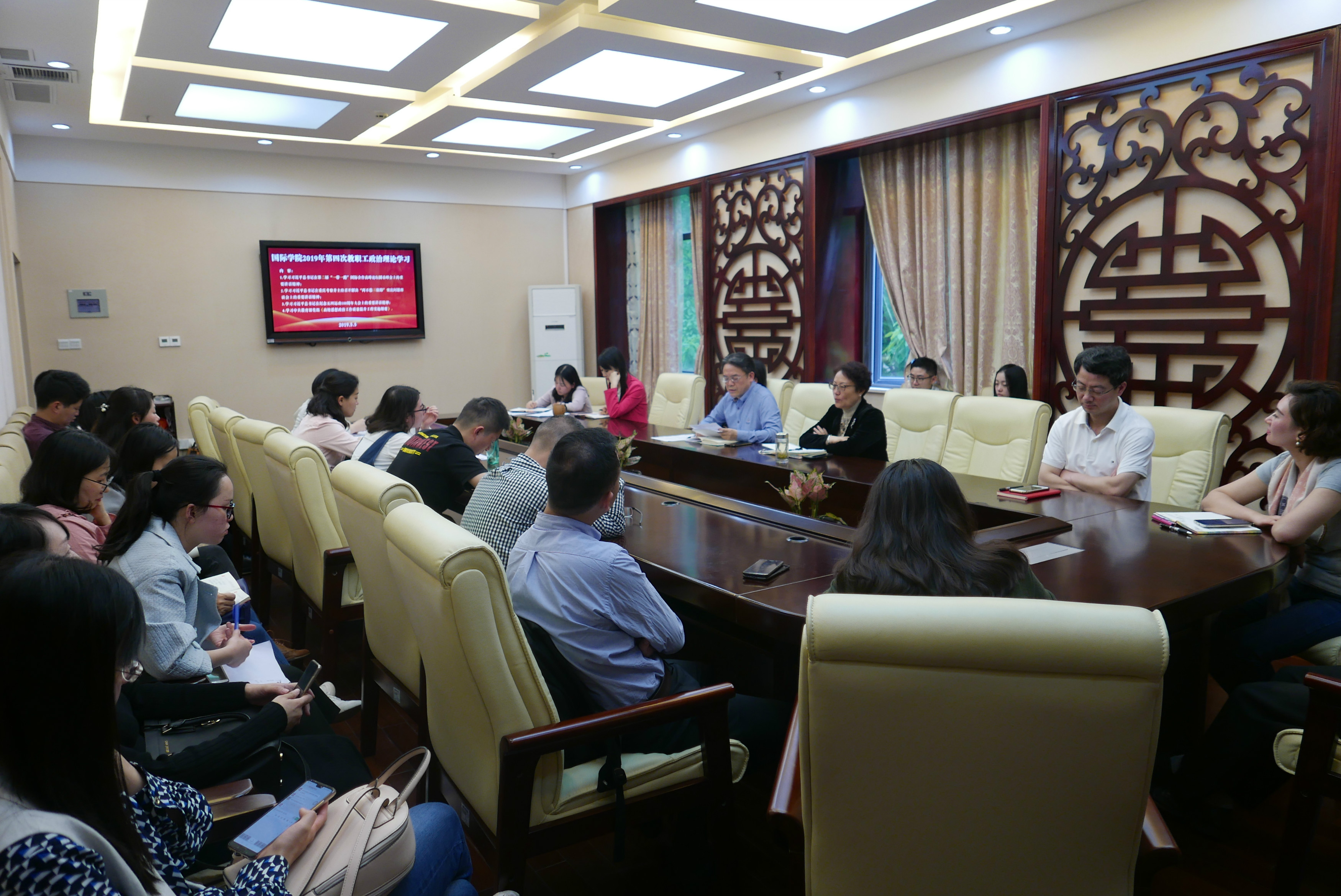 2019年5月5日下午3:00,sunbet申搏全体教职工在紫云楼签约室开展本年度第四次政治理论学习活动。会议由刘猛书记主持。