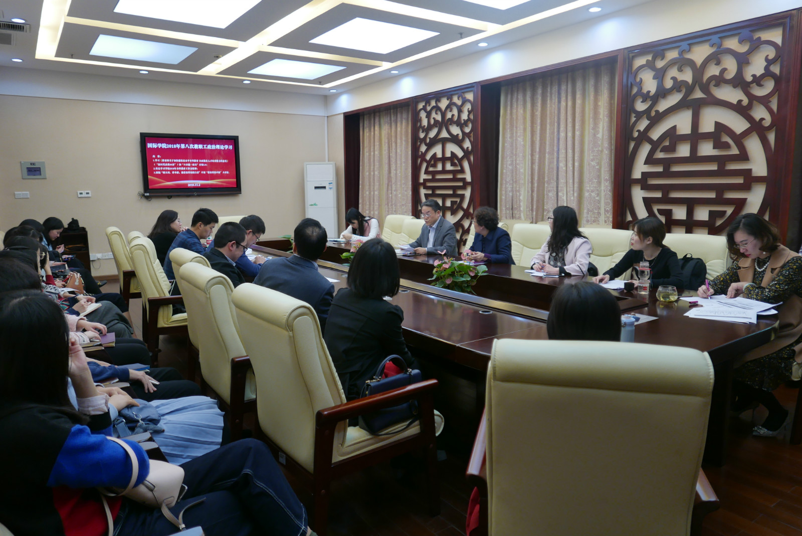 2018年11月2日下午3:00,sunbet申搏全体教职工在紫云楼签约室开展本年度第八次政治理论学习活动。会议由刘猛书记主持。