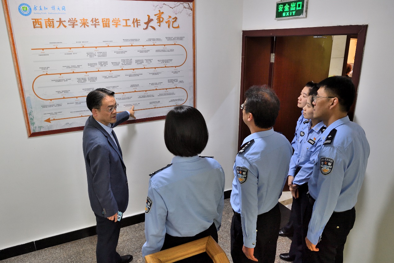 北碚区公安局出入境支队周庐飞支队长一行在刘猛书记的陪同下参观公司荣誉墙、来华留学工作图片展、汉语国际教育图书馆、国际员工心理咨询室等公司文化设施,公司来华留学工作取得的丰硕成果以及公司“中国味 国际范”的文化理念给警官们留下了深刻的印象。