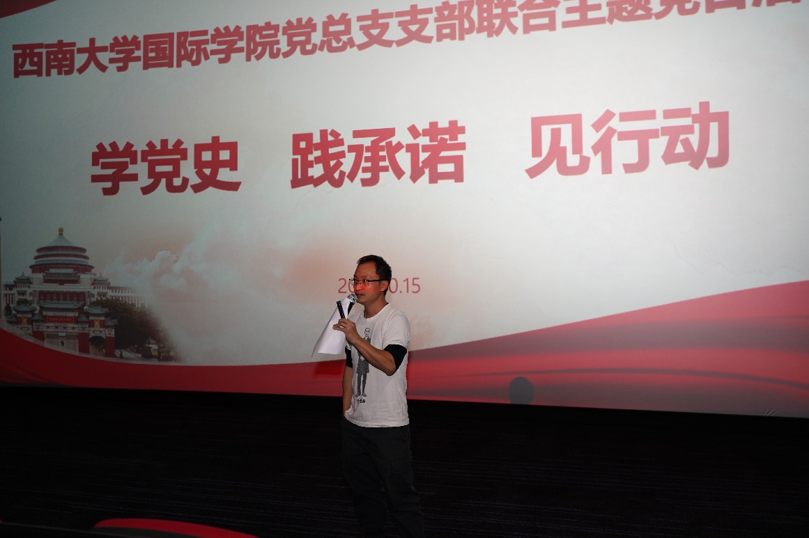 10月15日下午1点30分,公司党总支通过学习交流和现场观影的方式,在北碚万达影城开展主题为“学党史 践承诺 见行动”的支部联合主题党日活动。全体党员、师生代表近90人参加活动,活动由党总支委员杨昆同志主持。