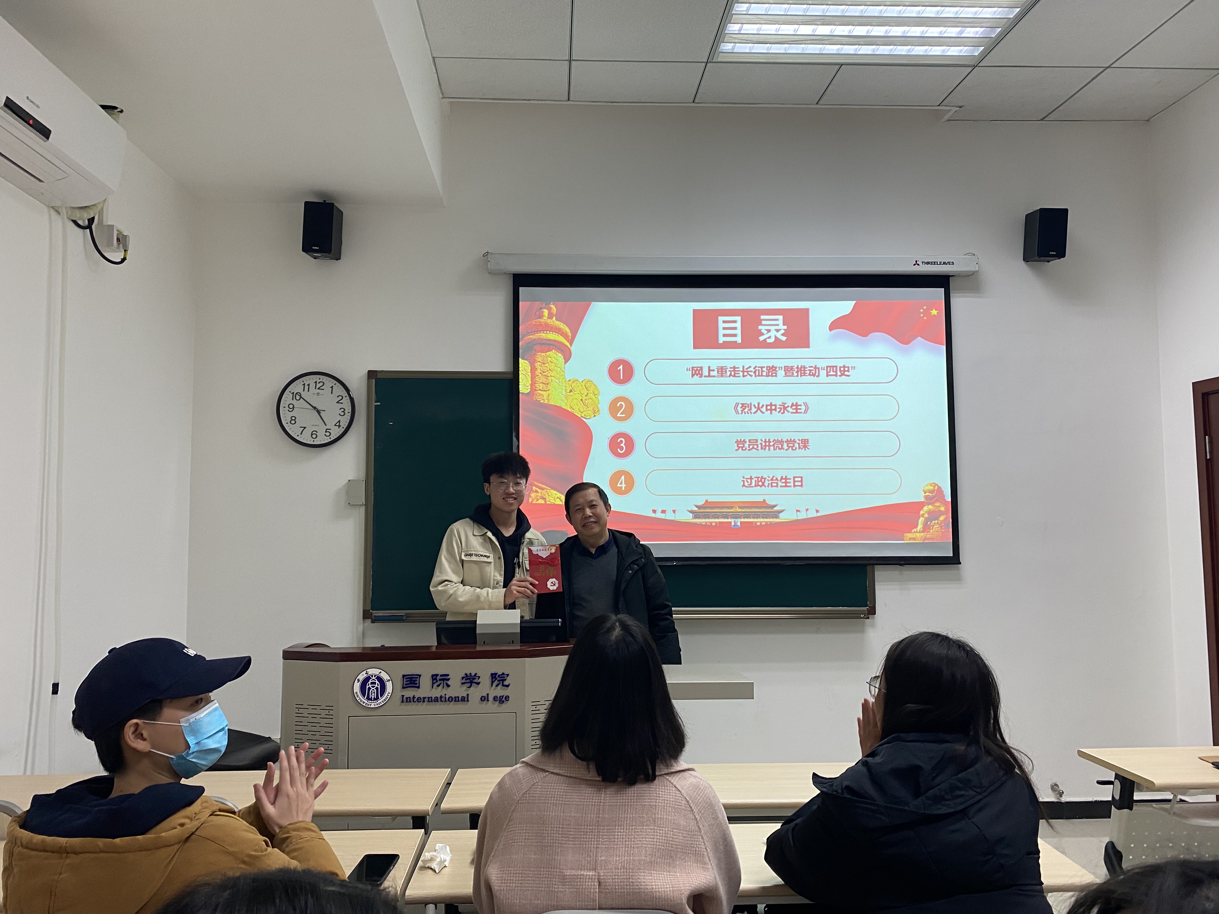 宣传委员许桐同志为大家详细导学《中共sunbet申搏委员会关于认真做好“网上重走长征路”暨推动“四史”学习教育的通知》精神,然后集中观看英雄故事视频短片--《烈火中永生》,接着是檀照杰、祝倩、安玥同志为大家讲述英雄故事微党课。通过重温英雄感人事迹,大家对“四史”学习教育的必要性充分肯定并表示要加强自身关于“四史”的学习。党总支书记刘猛同志、支部书记王湛明同志以及支部全体党员为在本月入党的党员过政治生日。