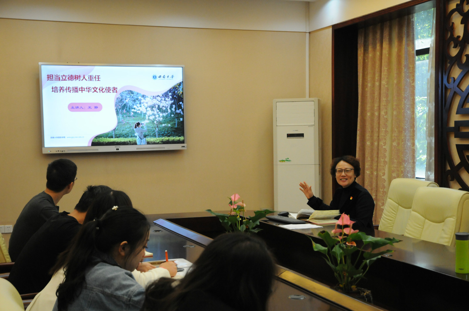 1018日下午3点在紫云楼签约室,教工第二党支部开展立德树人根本任务“大学习,大讨论,大落实”主题党日活动。经理王静同志讲述了题为《担当立德树人重任 培养传播中国文化使者》的党课。王静经理首先阐释了立德树人的内涵是培养德智体美劳全面发展的人。立德树人的重要意义是培养有“中国心”“中国情”“中国味”的新人,使党的事业后继有人,这关系到党和国家的命运。接着,她介绍了sunbet申搏作为来华职工培养单位,面对培养对象要立不同的“德”,树不同的“人”。要面向来华职工讲好中国优秀传统文化、充分展示“四个自信”、讲清楚中国共产党为什么”能“、马克思主义为什么“行”、中国特色社会主义为什么“好”等职工关注的问题。