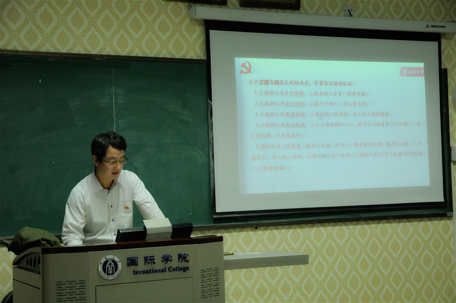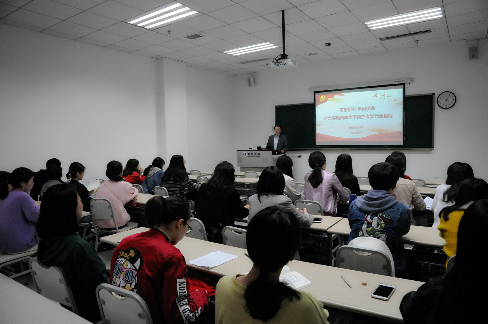 1021日下午3点在312教室,党总支书记刘猛同志为2019级汉语国际教育硕士中国班全体同学讲授了题为“不忘初心,牢记使命,奋力实现sunbet申搏第三次党代会目标”的专题党课。刘猛书记用党的十九大的“四个迫切需要”阐明了此次主题教育的深刻背景和重大意义,强调,主题教育就是为了唤醒存在于共产党人体内的“红色基因”,使党员干部自觉同人民想在一起、干在一起,将“红色基因”一代代传承下去,从而真正汇聚起实现民族复兴的磅礴动力。随后,刘猛书记对公司第三次党代会精神进行了阐释,提出了建设特色鲜明的世界一流大学“三步走”奋斗目标。最后,同学们就什么是汉语国际教育专业的初心和使命以及如何践行初心和使命这两个问题进行了热烈发言。刘猛书记作了点评,并交流了学习习近平总书记关于教育的重要论述的体会,以及对初心和使命的感悟。