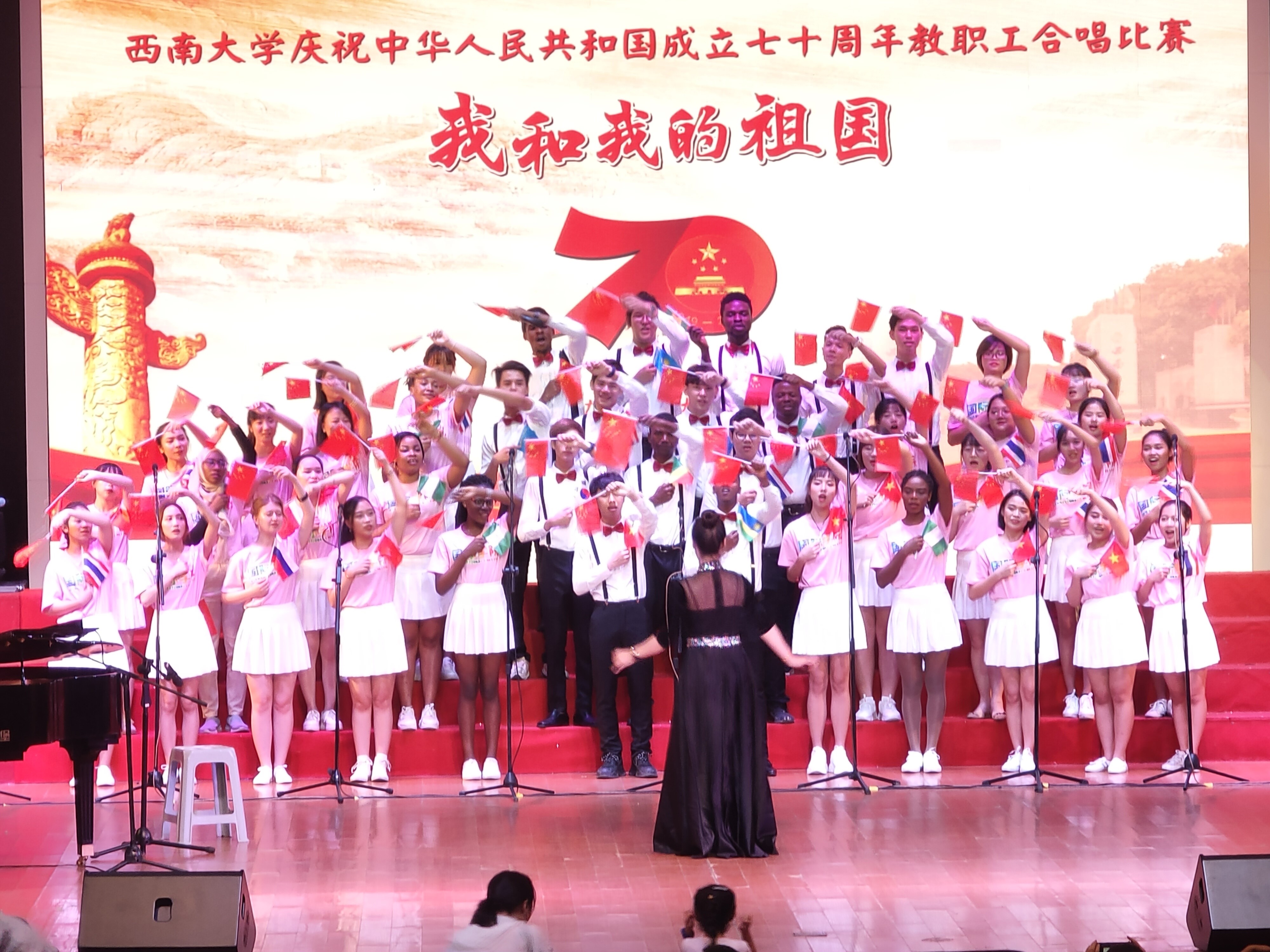 本次展演五洲合唱团演唱的曲目分别是《友谊地久天长》《我和我的祖国》。在演出中,团员们感情充沛,歌声美妙,现场效果甚佳,获得了观众的一致好评!演唱《我和我的祖国》时,每位团员手持中国国旗和自己国家的国旗在空中挥动,这传递着团员们对中国的美好感情,也表达着他们对中外友谊的美好祝愿。