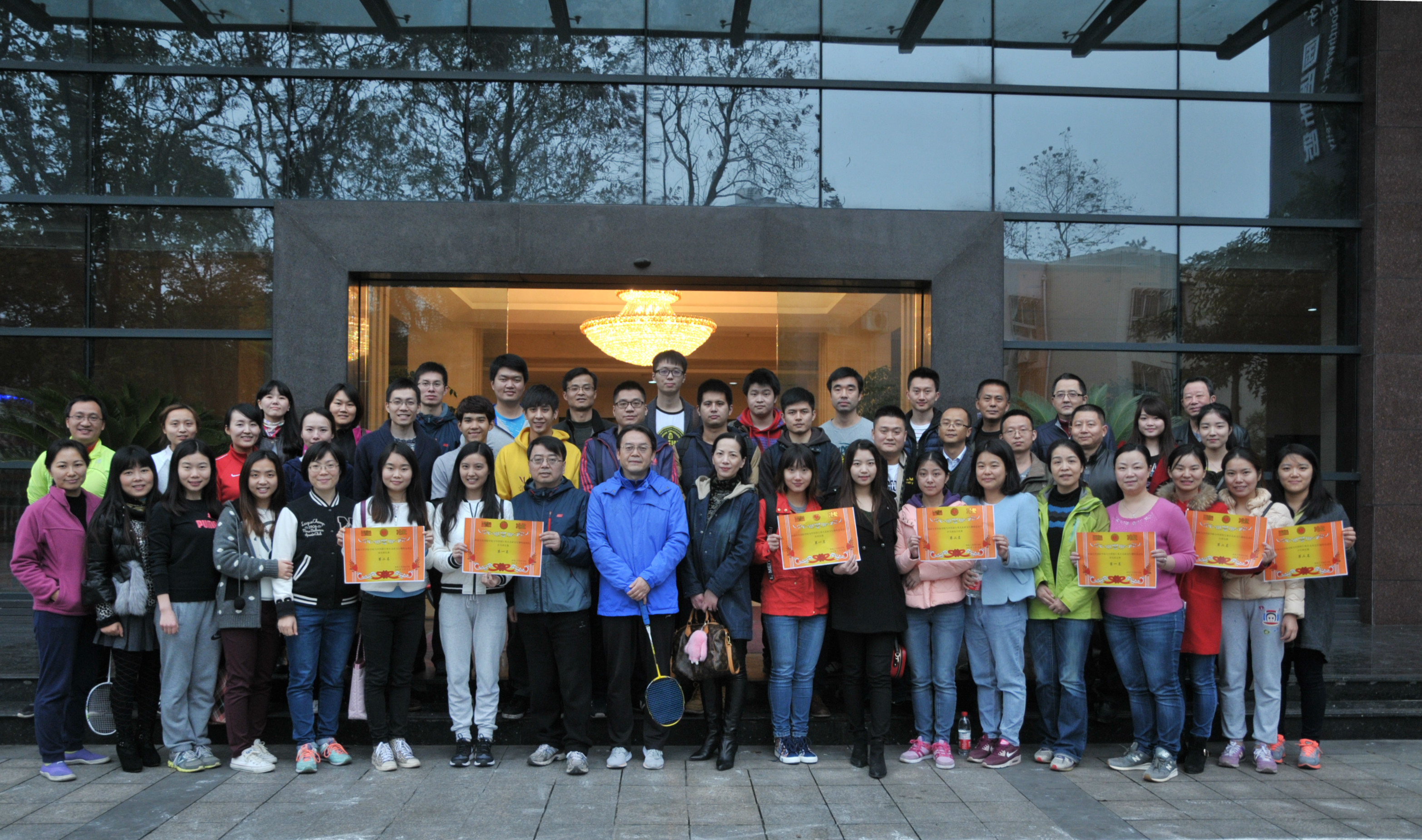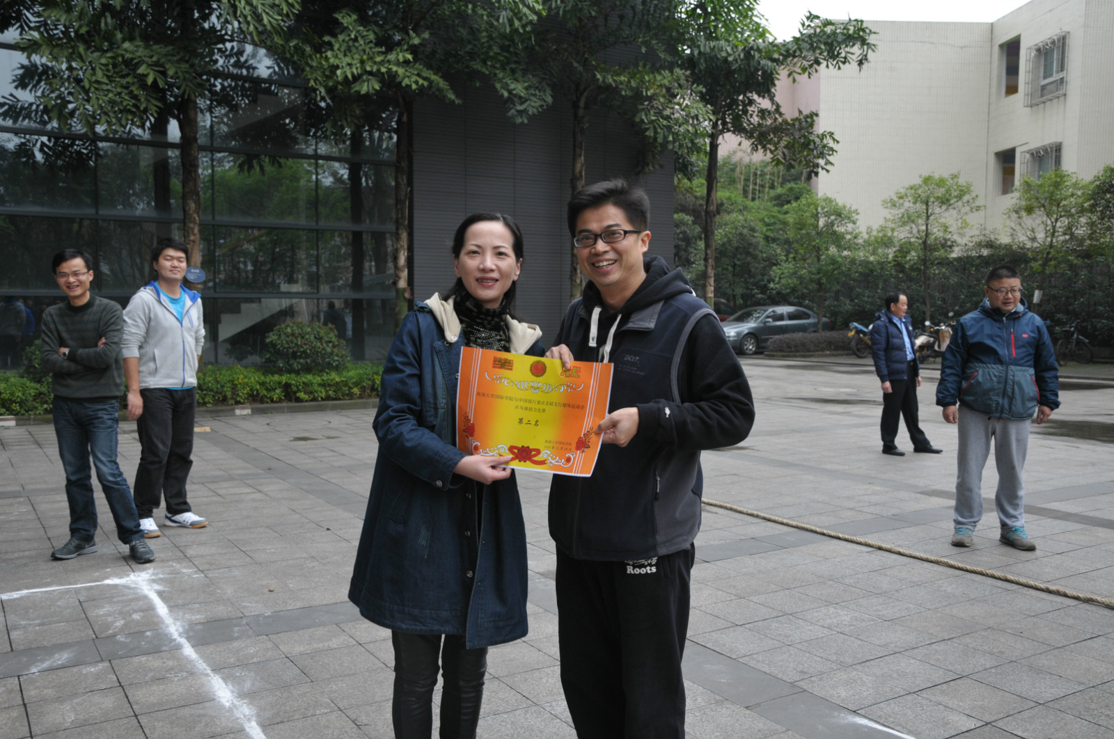 随着林千彭一个漂亮的击球,黑色8号球应声进洞,整场比赛落下帷幕。经过双方代表队激烈角逐和裁判们公正的评判,sunbet申搏代表队获得乒乓球迎面接力比赛、乒乓球项目和台球项目的一等奖,中国银行重庆北碚支行获得拔河比赛和羽毛球项目的一等奖。双方赛后在紫云楼前合影留念。