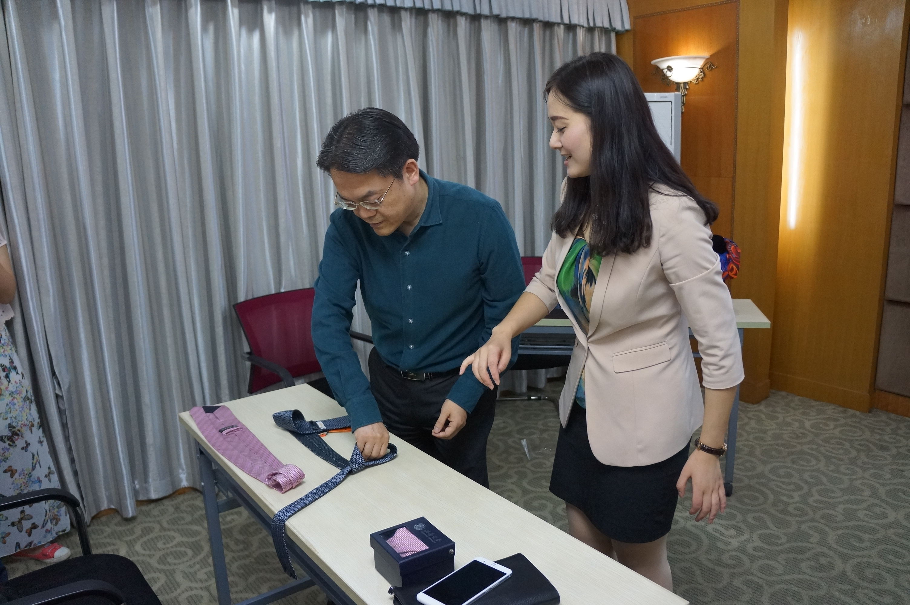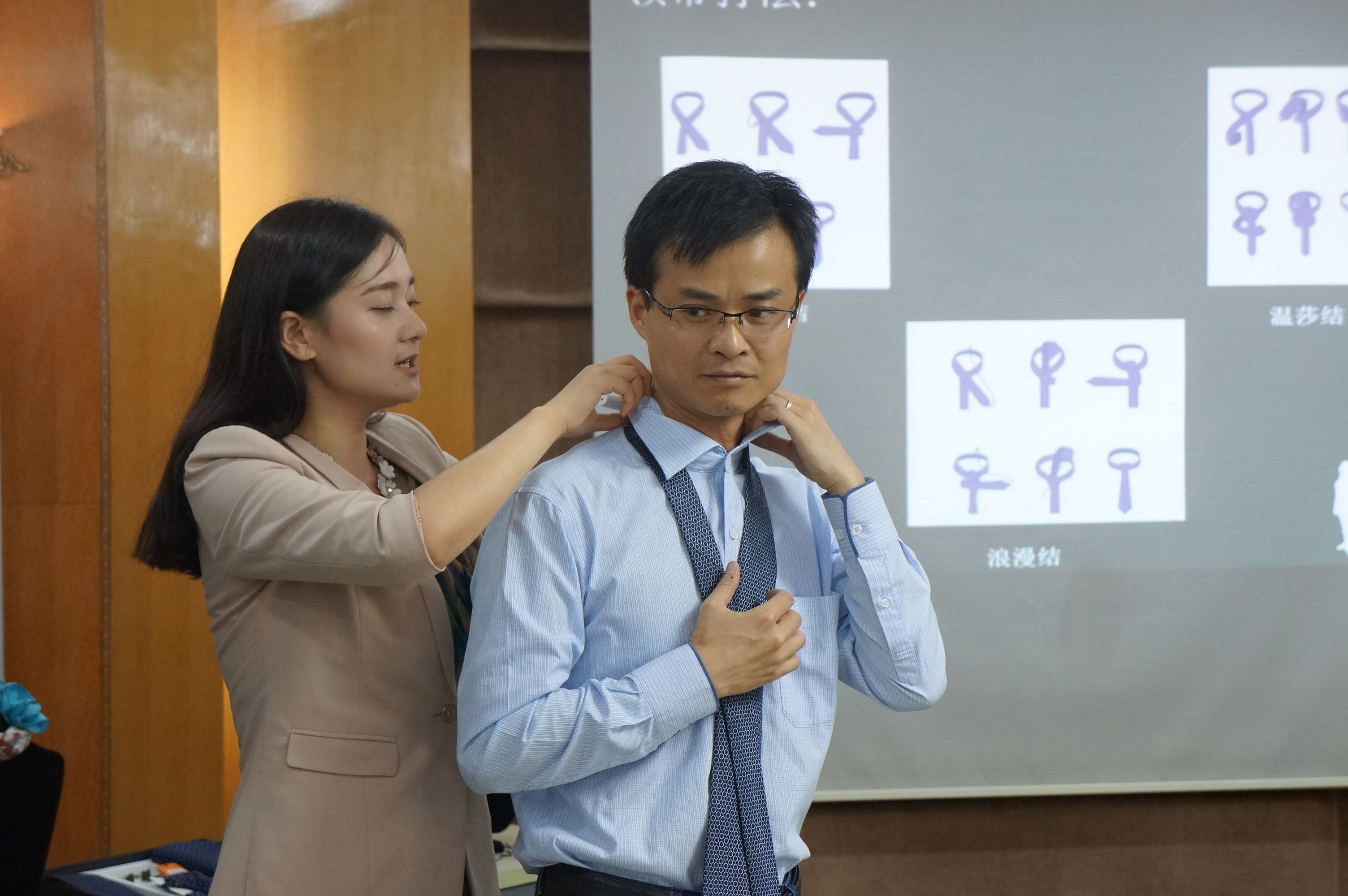 万事利集团高级礼仪讲师任静做专题演示,内容涉及职场礼仪、服装搭配、化妆礼仪等。她提出,服装礼仪要充分考虑场合、时间、对象,男士着西装要遵循“三三原则”。她还现场演示如何将一条普通的丝巾千变万化为着装画龙点睛,男士领带的各种系法,如何保持最美的微笑……任静老师专业的讲解、娴熟的手法让大家啧啧称赞,代远鸿、耿军、徐心三等老师更是现场变身模特,上台学习、展示,现场气氛热烈。